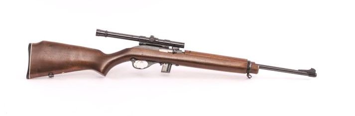 Marlin Model 989 M2 semi-automatic carbine, .22 Long Rifle caliber, Serial #NSNV. The carbine is in very good overall condition with an 18” barrel with a ramped blade front and adjustable rear sights. The metalsurfaces retain the majority of their blued finish with high edge wear noted. The smooth wood stocks are in good condition with small mars and scrapes from carry and use. The buttstock ends with a Marlin marked checkered plastic butt plate and includes sling swivels. The rifle is topped with a Weaver B4 fixed power scope and includes one correct magazine. The bore is good, the action is crisp and the markings are sharp on thismilitary style Marlin M2 carbine. Est.: $125-$250. (Modern).