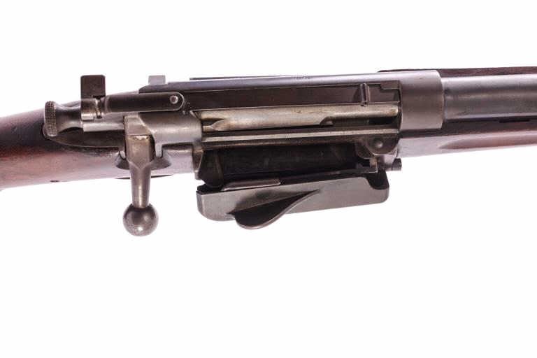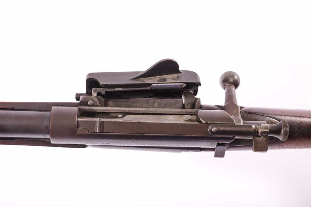 Sporterized U.S. Springfield Model 1896 Krag bolt action rifle, .30-40 Krag caliber, 24” barrel, military finish, altered wood stock with added checkered pistol grip, S/N 89065; overall good condition with majority of muted blued military finish remaining on metal parts, good bore, crisp action and good markings; modified stock includes nicely added rear 4” of butt stock. (Antique). Est.: $300-$600.