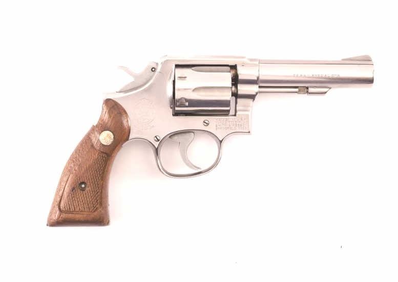 Smith & Wesson Model 64-3 revolver, .38 S & W Special caliber, Serial #1D35995. The pistol is in good overall condition with a 4” barrel. The metal surfaces retain the majority of their stainless steel finish with holster wear at the muzzle and along the top strap. The left side of the frame is inscribed, “Y.P.D. 24”. The checkered wood medallion grips are in good condition showing moderate to heavy wear, particularly on theright panel. The bore is good, the action functions and the markings are legible. Est.: $350-$700. (Modern/PPT).