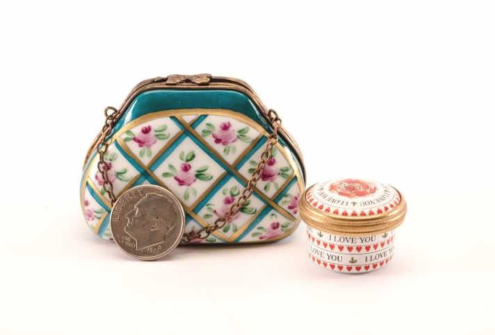 Halcyon Davis small “I Love You” pill porcelain container, approximately 1” diameter with rose on lid plus a small Limoges porcelain purse, approximately 3” x 2” overall. Est.: $75-$125.