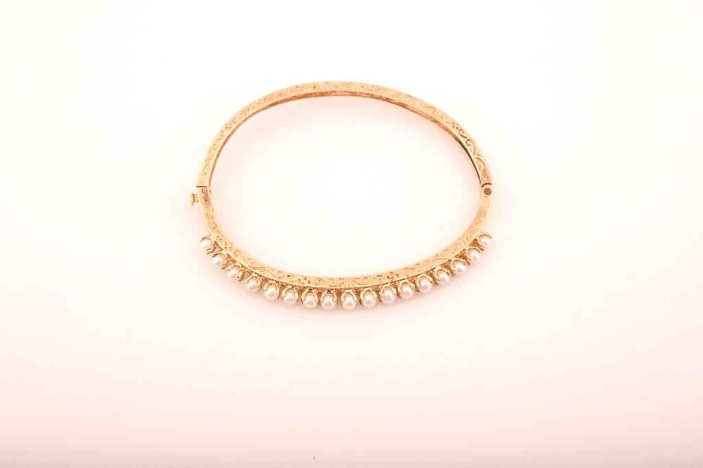 One vintage hand fabricated bangle bracelet set with natural pearls made in 14k yellow gold weighing 12gms Est:$300-600