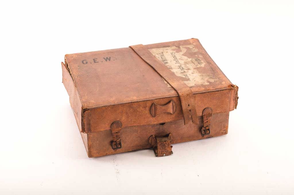 Officer’s writing desk with leather cover showing embossed initial G.E.W. Railroad shipping label personalized Major G.F. Whithall. Diamond jubilee patent dispatch box maker’s label circa 1897. Metal is very good to near fine. The leather is good with damage to seam and missing straps. Measures 16” x 11 ½” x 8” deep. Should be researched. Est.: $175-$350