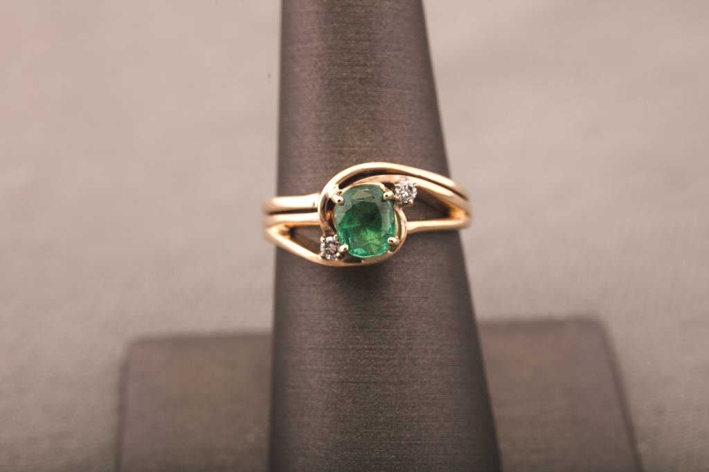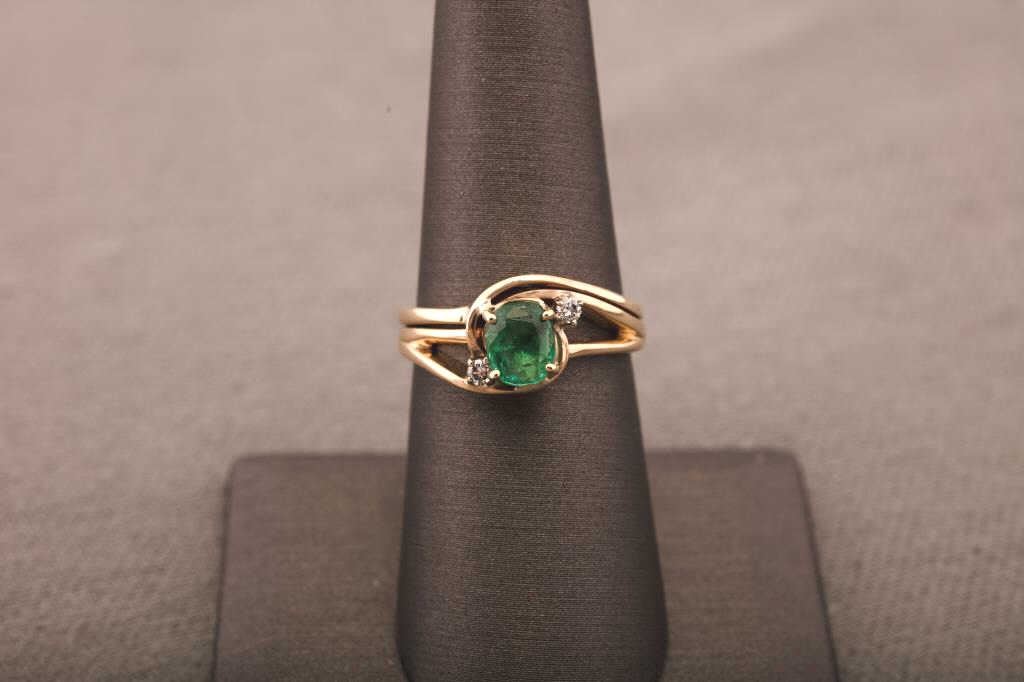 One emerald and diamond ring in 14k yellow gold set with a oval emerald and 2 side diamonds Est:$500-1000