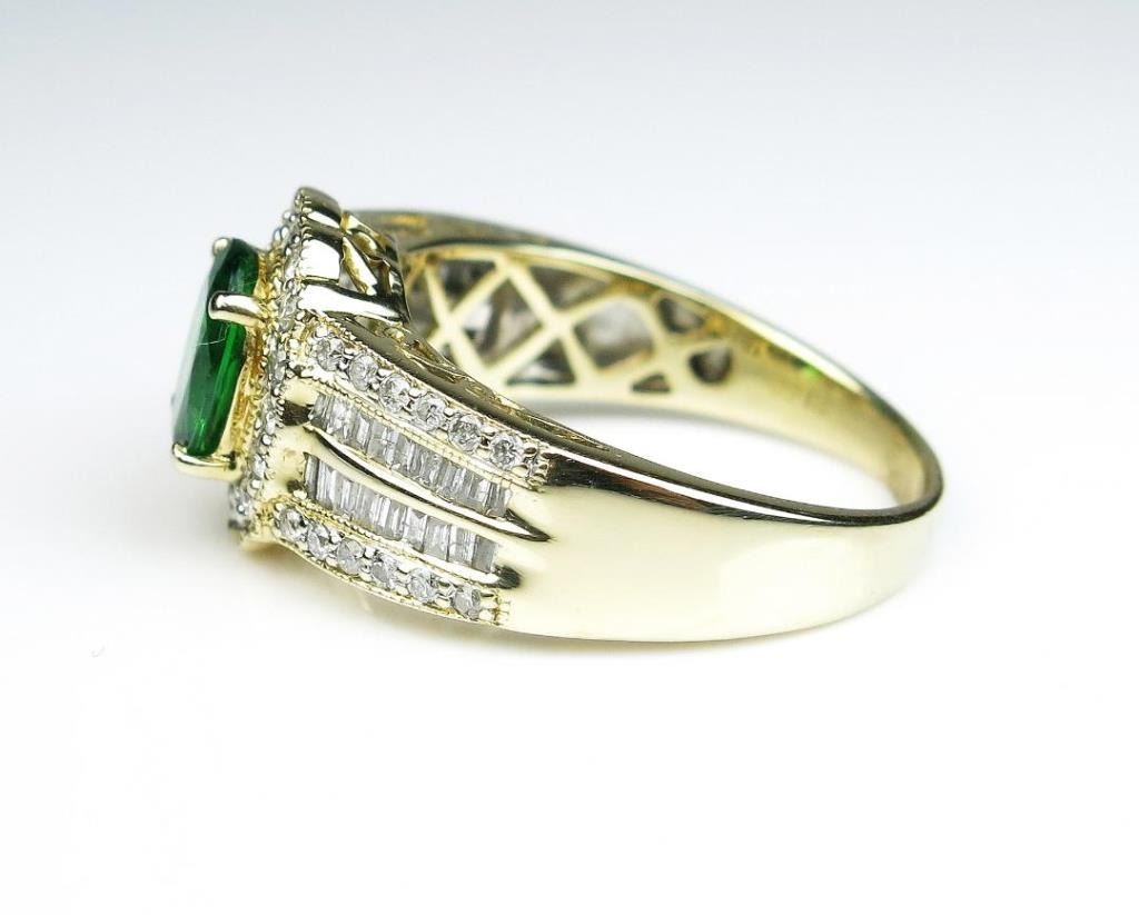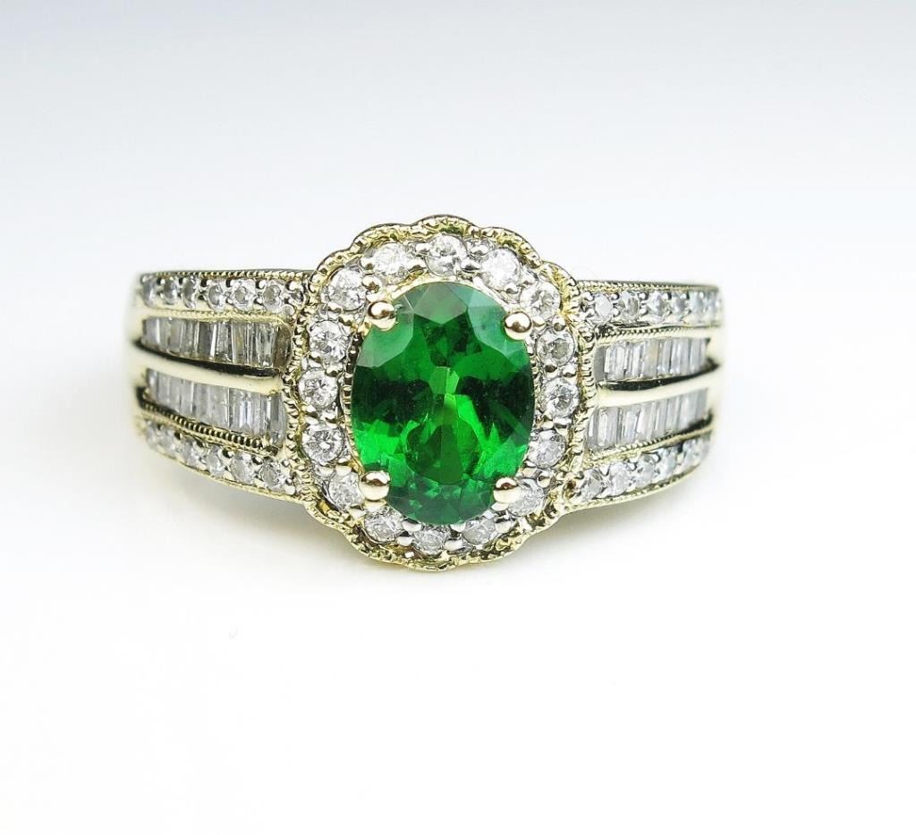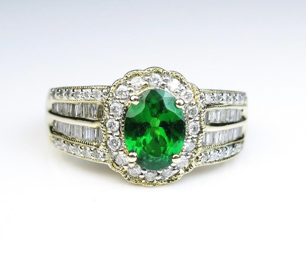 Radiant Tsavorite Garnet and Diamond Ring featuring an intense green oval cut Tsavorite Garnet weighing approx. 2.00 carats accented with over 80 round and baguette cut Diamonds weighing approx. 1.50 carats with G-H colors and SI clarity set in beautiful 14 karat yellow gold setting. Retail $4,000-$5,000 Estimates $2,000-$3,000