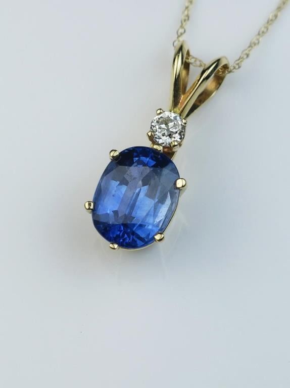 Vibrant Blue Sapphire and Diamond Pendant featuring a vivid oval cut Cornflower Blue Sapphire weighing approx. 3.50 carats accented with an ‘Old European Cut’ Diamond weighing approx. 0.25 carats of G-H color and VS clarity set in 14 karat yellow gold setting. Retail $4,000-$5,000 Estimates $2,000-$3,000