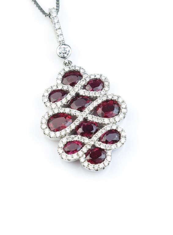 Exquisite Ruby and Diamond Pendant featuring 10 oval ‘PIGEON’ blood Rubies weighing approx. 3.00 carats and 120 ‘IDEAL’ cut Diamonds weighing approx. 0.75 carats of F-G colors and VS clarity set in gorgeousdesigner style14 karat white gold setting. Retail $4,000-$5,000 Estimates $2,000-$3,000