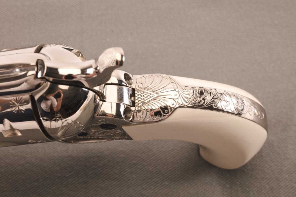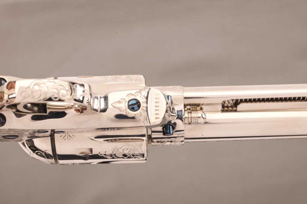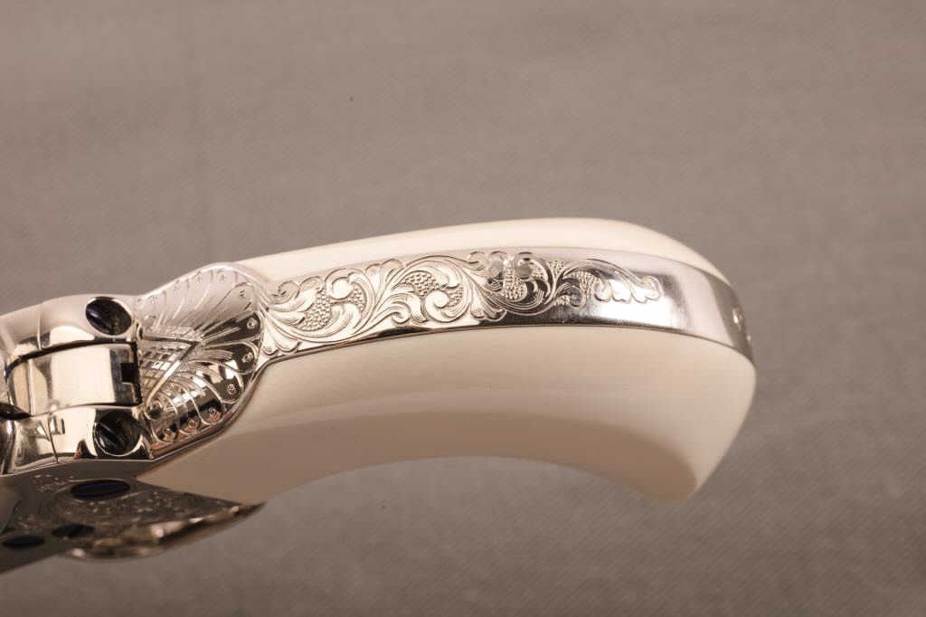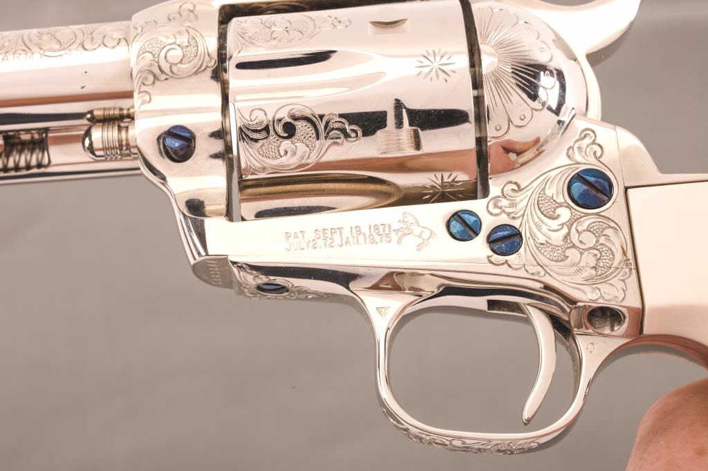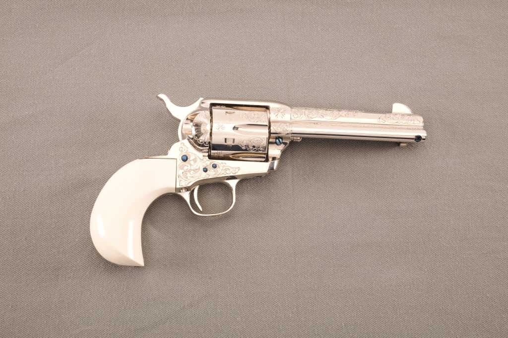Colt SAA Revolver in .45 L.C caliber with a 4 ¾” barrel, factory “B” engraved, nickel finish, ivory grips, and black powder style frame. Custom shop order #4777. Excellent to mint in cardboard box with matching end label and French style display case. Top of case shows minor scratches. The estate of Marvin Essenmacher. (Modern/No PPT). Est.: $2500-$5000