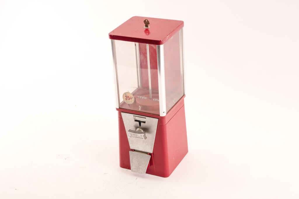 Vintage commercial candy vending machine with key. The machine is approximately 17” tall by 6” wide and is in good overall condition marked Eagle Vending Machines in the front pane and on the handle. A nice 1950’s-1960’s era decorator piece. Est.: $100-$200.
