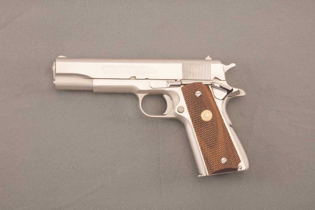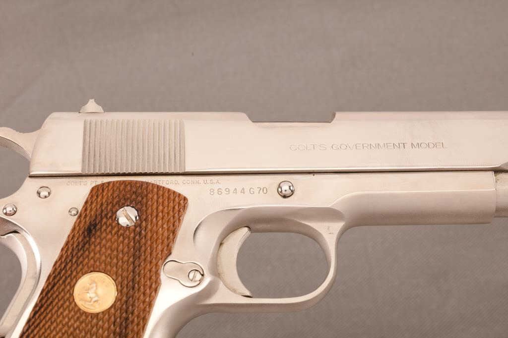 Colt MKIV/Series 70 Government Model Semi-Auto pistol in .45 caliber with nickel finish, 5” barrel, and checkered medallion grips, S/N 86944G70 in box. The pistol is in excellent condition showing just slighthandling marks and little use. The bore is excellent. The box shows tape repair to the end label. Instruction manual included. (Modern/PPT) Est.: $1500-$3000