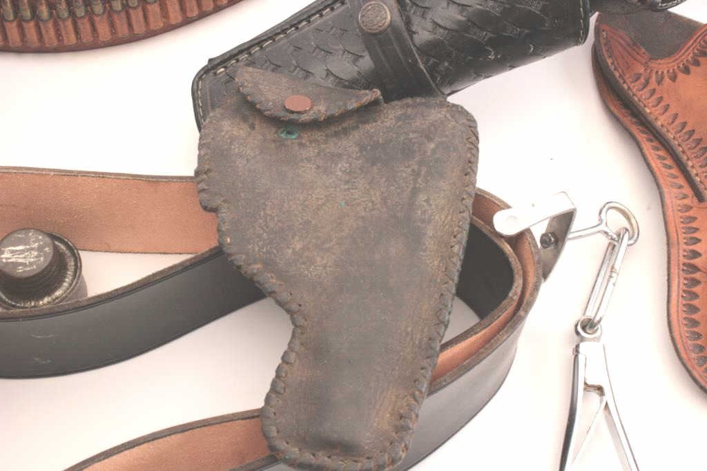 Box lot of commercial leather including several rigs for revolvers, two flap holsters for large frame revolvers, a tooled holster for a 22 buntline, and several misc. holsters. Est. $50-100