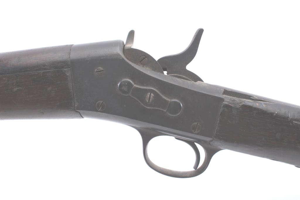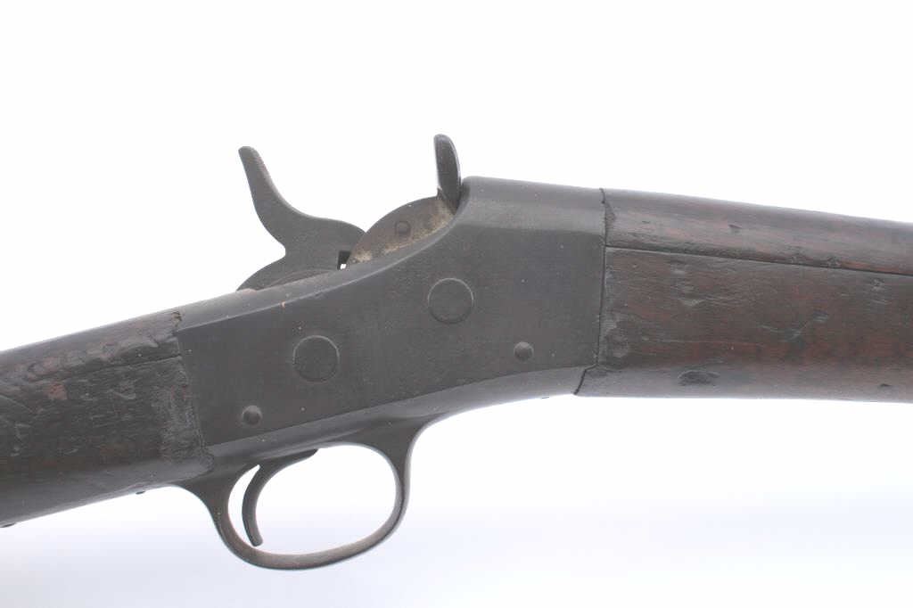 Remington Rolling Block rifle, 7mm caliber, 30” barrel, dark patina to metal surfaces, wood stocks with sling swivels, no visible S/N; overall un-cleaned fair + condition with working action, dark bore and fair + wooddisplaying scattered mars and scratches from carry, handling and storage. (Antique). Est.: $150-$300.