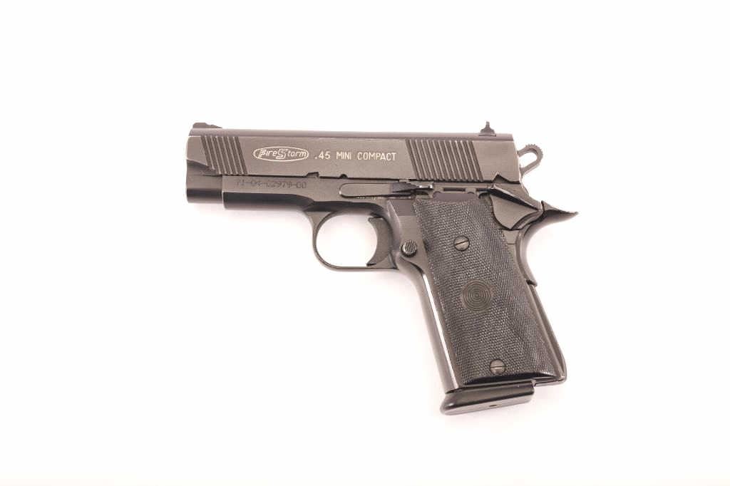 Spanish FireStorm Mini Compact semi-automatic pistol, .45 caliber, 3.5” barrel, black finish, checkered hard rubber grips, S/N 71-04-02979-00; overall very good condition displaying majority of finish to metalsurfaces, very good bore, crisp action, sharp markings and good grips with a thin crack to the right grip at the top securing screw. (Modern/PPT). Est.: $175-$350.