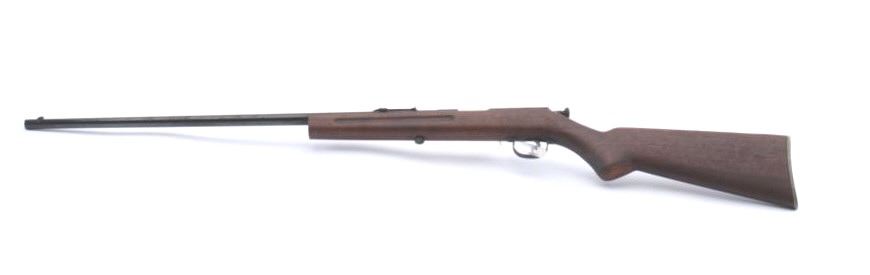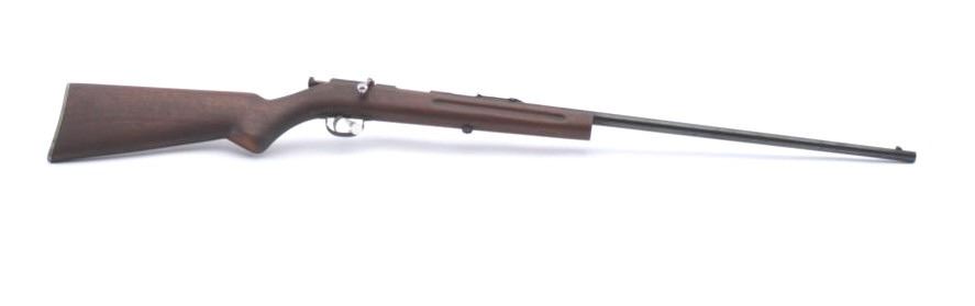 Remington Model 33 bolt action rifle, .22 short, long or LR caliber, 24” barrel, black finish, wood stock, no visible S/N, overall fair to good condition showing majority of black finish to metal surfaces, workingaction, dark bore, good stock with an old replaced piece to the bottom of the semi-pistol grip. (Modern). Est.: $60-$120.