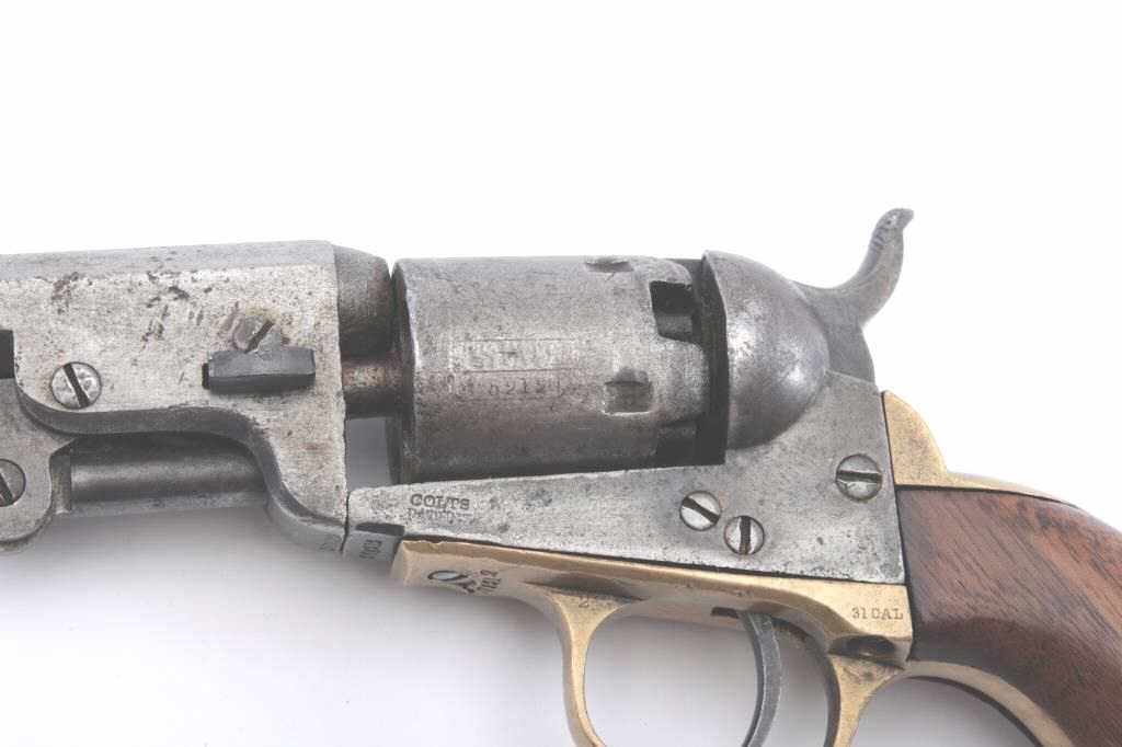 Colt 1849 Pocket Model percussion revolver, .31 caliber, Serial #275212. The pistol is in good overall condition with a 4” octagon barrel. The metal surfaces are a uniform grey patina with sharp edges and a crispbarrel address. Faint traces of the cylinder scene remains and the serial numbers on the frame, trigger guard, barrel and cylinder are all matching. The Colt patent mark on the left side of the frame is legible. There is a small crack ahead of the trigger guard and knackering along the edge. The wedge is an unmarked, newer replacement and the rammer is unmarked. The smooth wood grips are replacements and the wood is proud at thetoe. The action is not functioning at the time of description. Est.: $400-$800. (Antique).