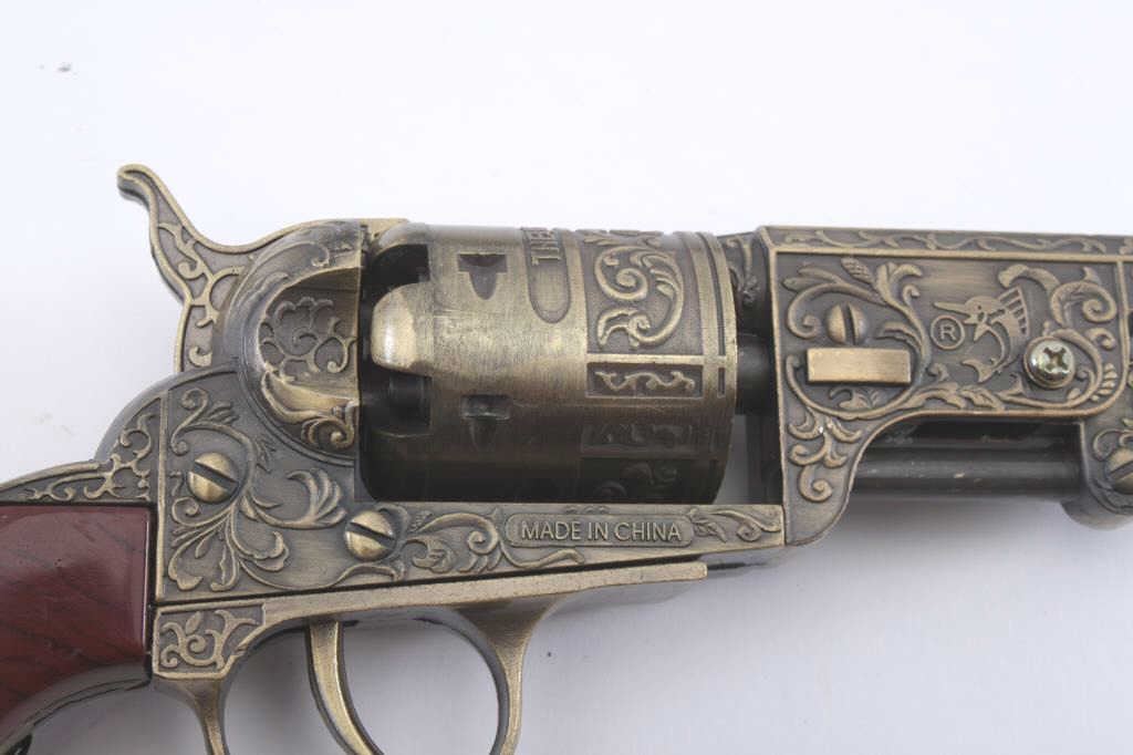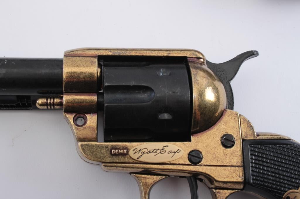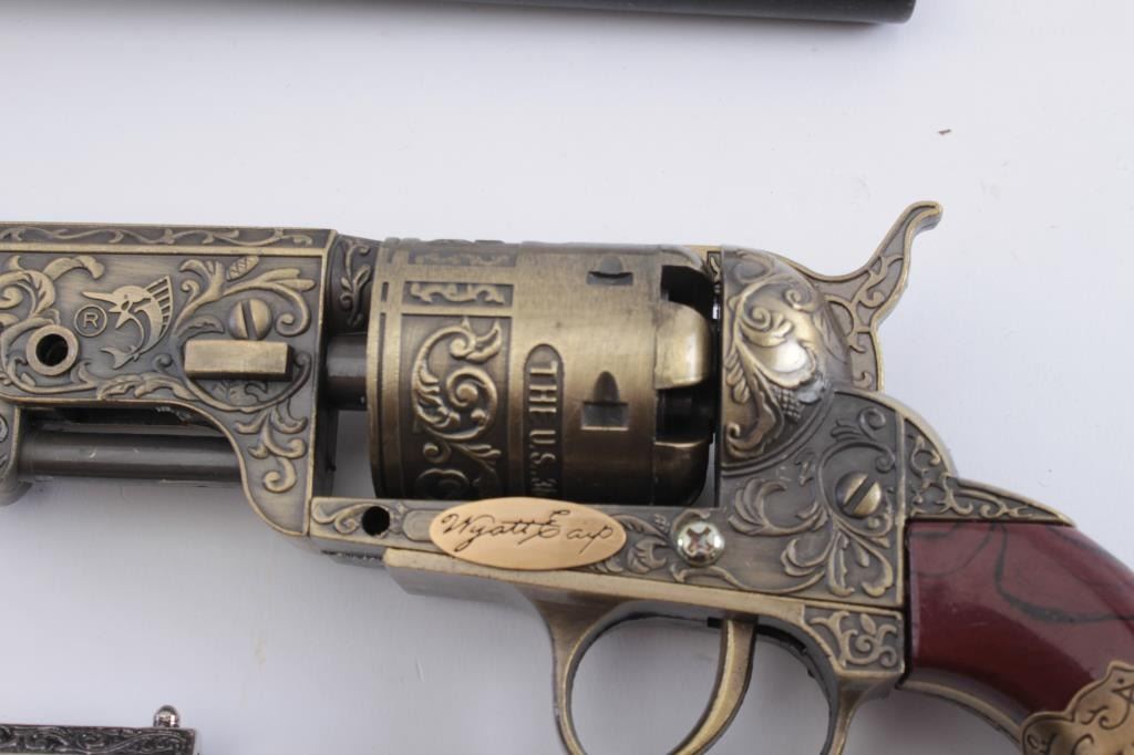 Lot of 3 die cast decorator Navy style (Non-Firing) pistols. 2 Wyatt Earp motif. 1 engraved Navy. $100 each retail. Est.: $100-$200