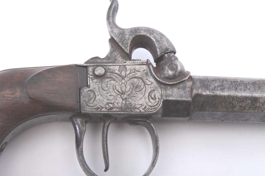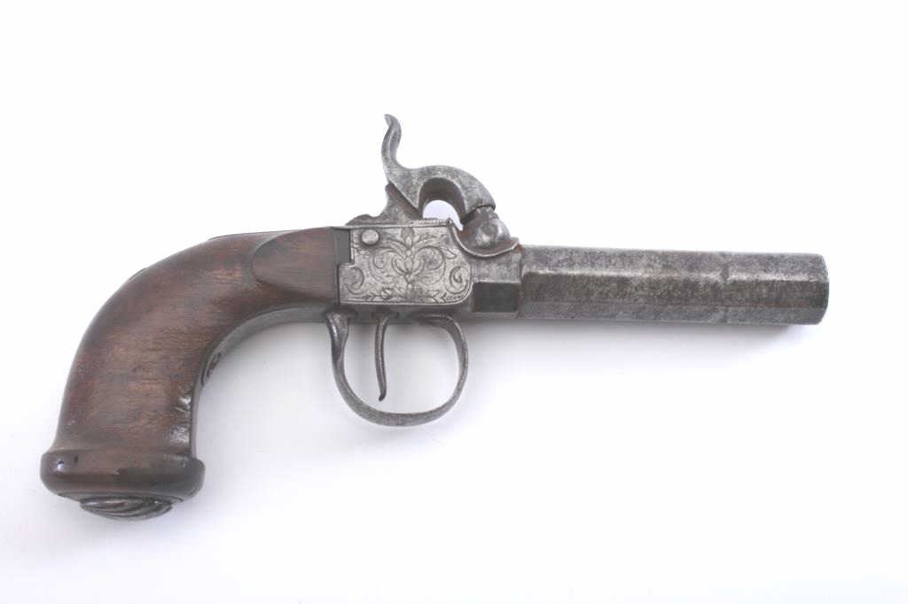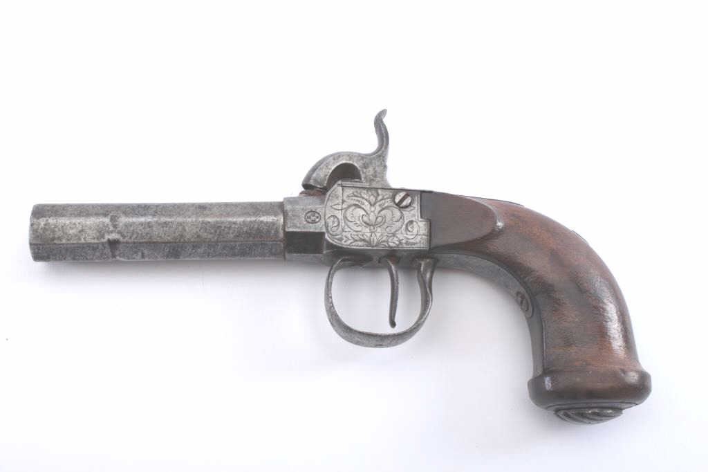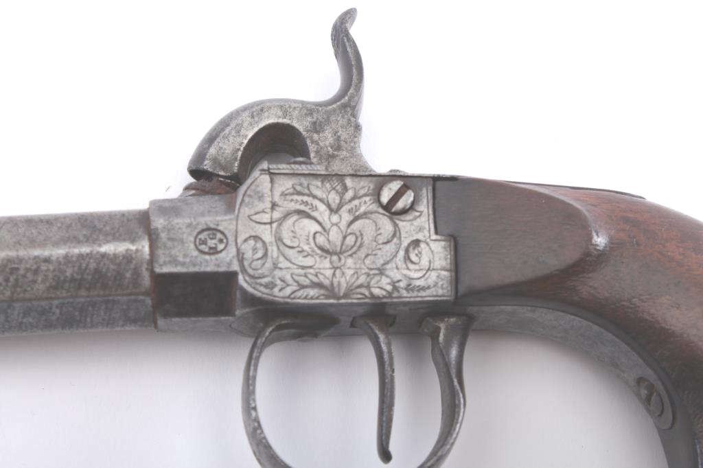 Belgian center hammer pocket percussion pistol, .45 caliber, Serial #NSNV. The pistol is in good overall condition with a 2 7/8” octagon barrel. The metal surfaces have gone to grey patina with light surfaceerosion evident. The receiver is nicely engraved and marked with a Liege proof on the left side. The smooth wood grips are in good condition with small mars from carry and use. The base of the pistol grip features a trap with a hinged lid marked like a scallop shell. A nice Belgian marked pistol circa 1850-1860. Est.: $175-$350. (Antique).