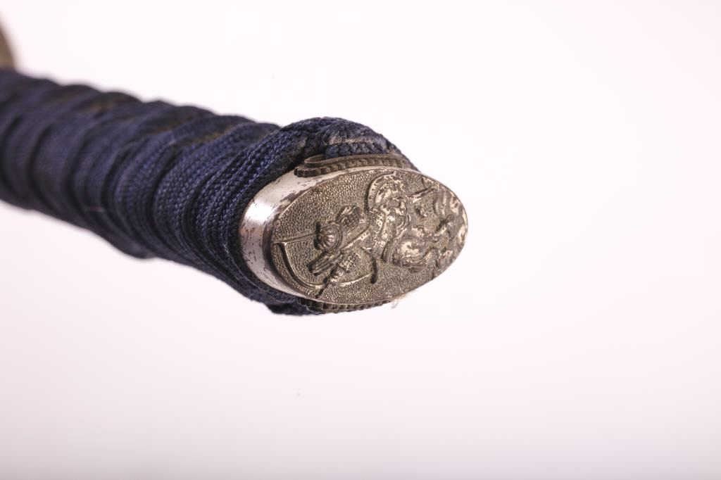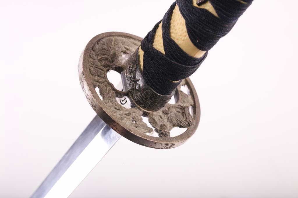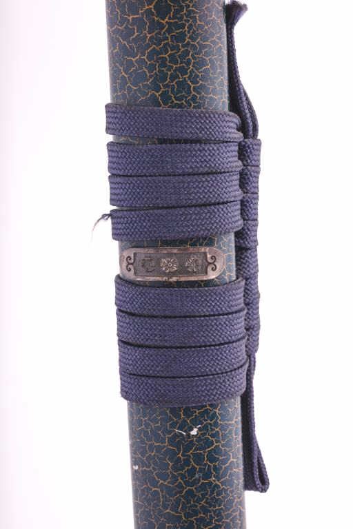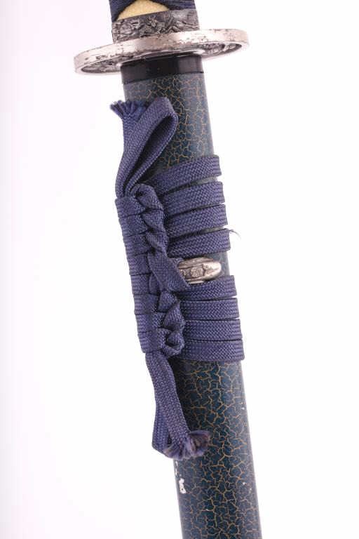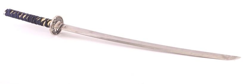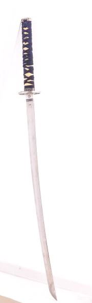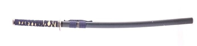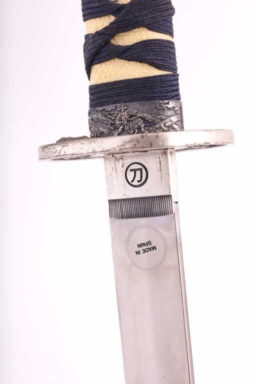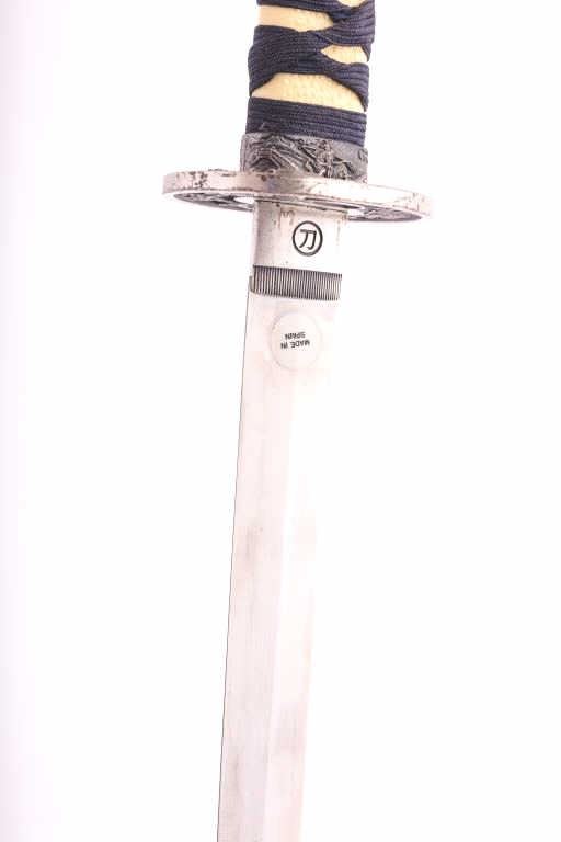 Reproduction Samurai sword with scabbard. The sword is in very good condition with an overall length of 38” and a 28” blade. The blade is marked, “MADE IN SPAIN” and does not appear to have been sharpened. The cordwrapped handle and painted metal scabbard are both in good condition as well. Est.: $50-$100.
