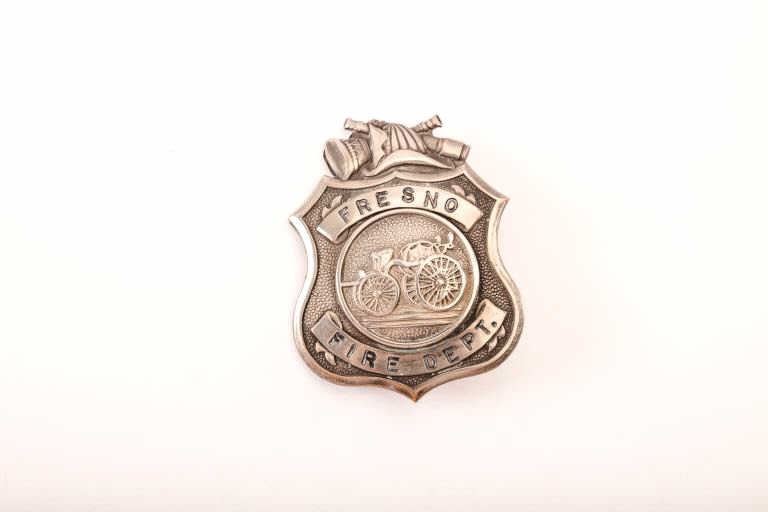 Small Fresno Fire Dept. badge, no markings on reverse; shows age; good overall condition. Est.: $30-$40.