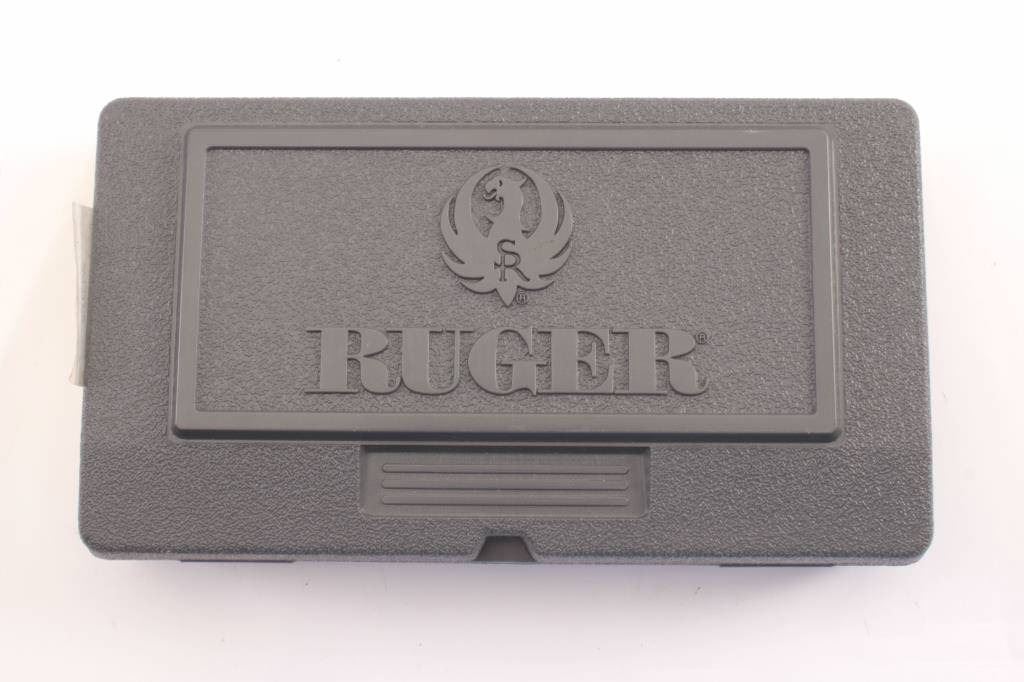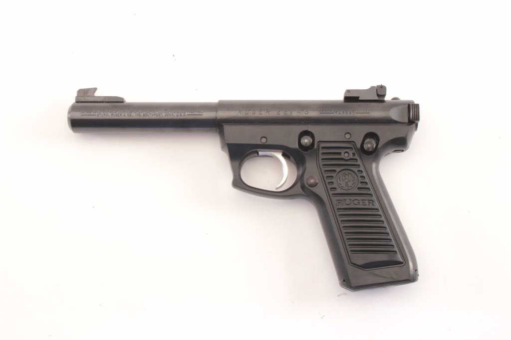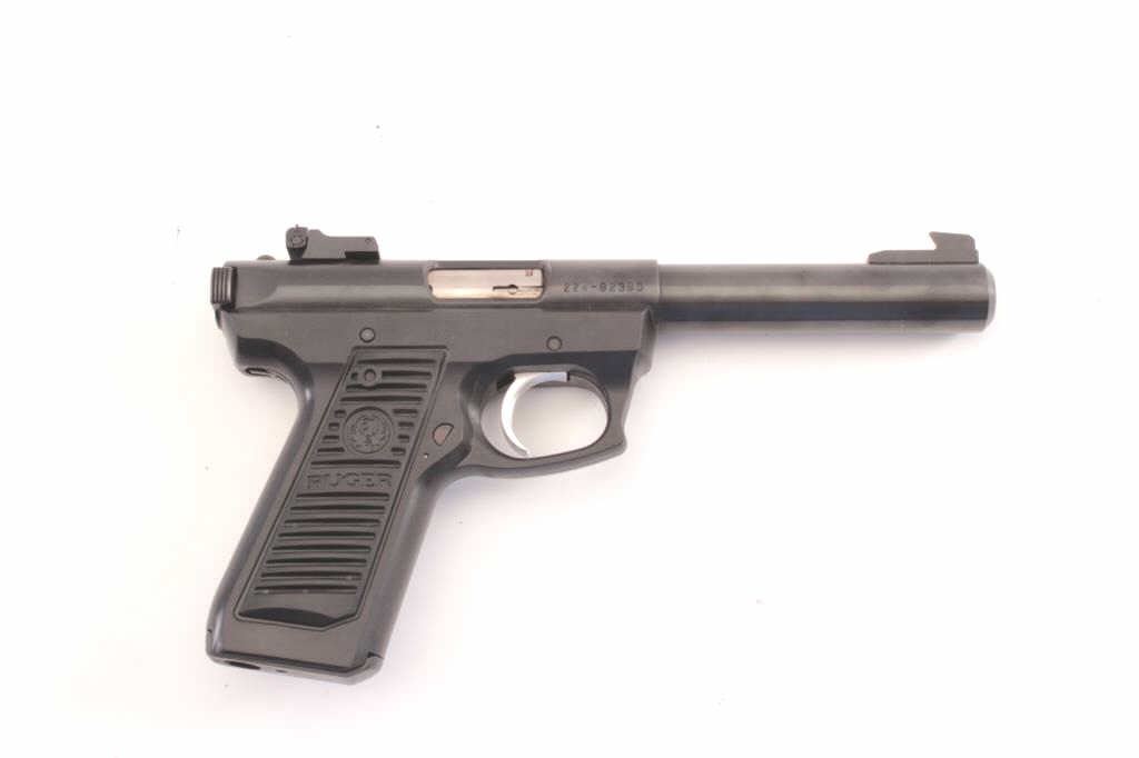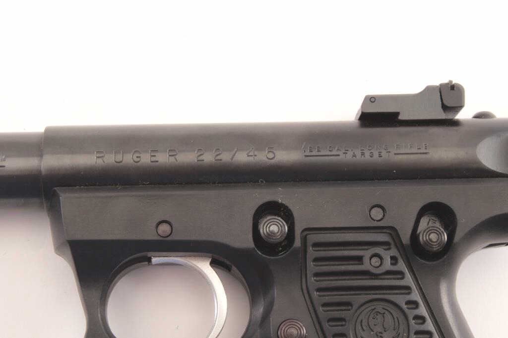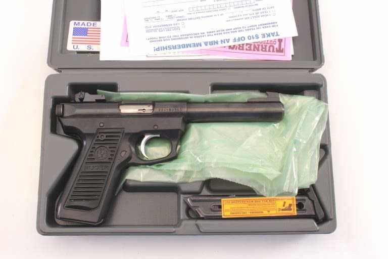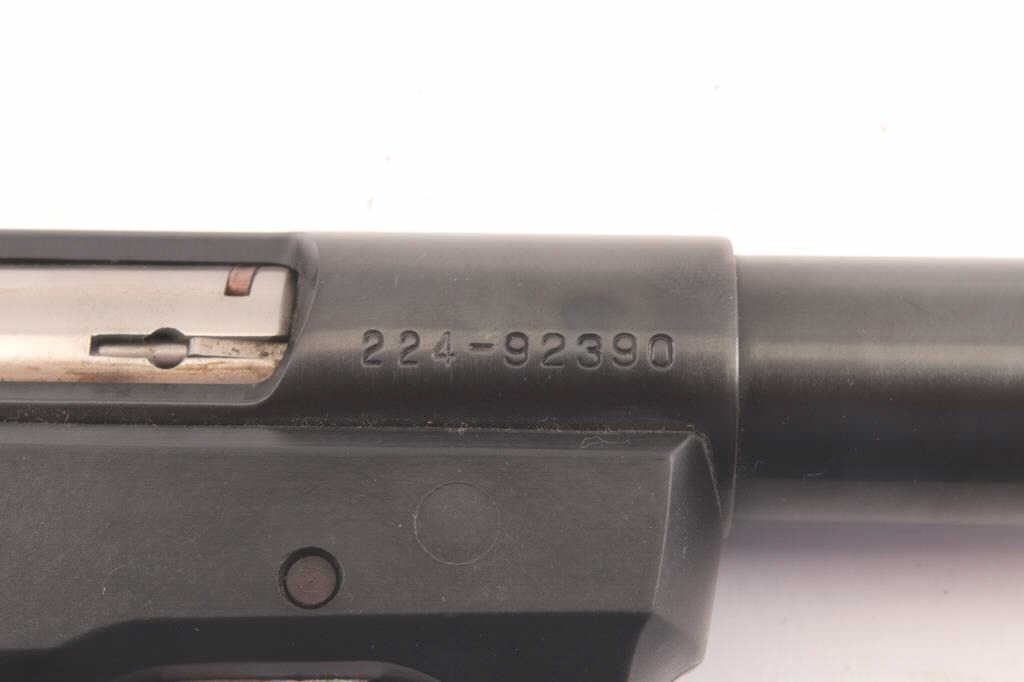 Ruger Model 22-45 semi-automatic target pistol, .22 LR caliber, Serial #224-92390. The pistol is in very good overall condition with a 5 ½” bull barrel. The metal surfaces retain the majority of their matte bluefinish with high point edge wear on the barrel. The front sight is a ramped blade while the rear is adjustable. The ribbed plastic grips are in very good condition. The bore is good, the action is crisp and the markings are sharp. The lot includes the factory plastic box with matching end label, two correct magazines and all associated packaging materials. Est.: $175-$350. (Modern/PPT).