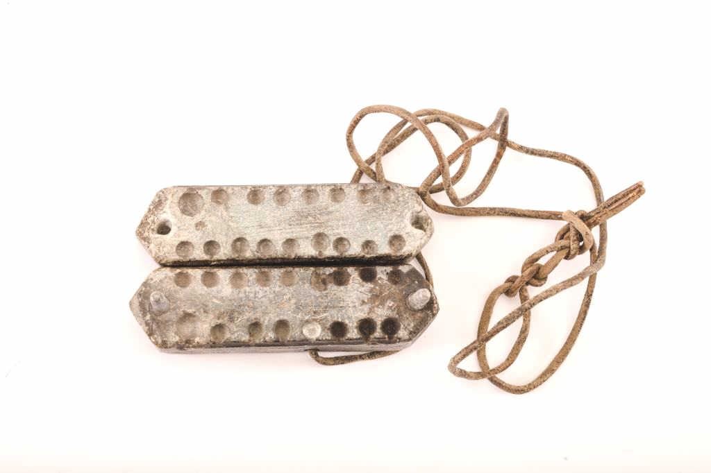 American 17th Century two piece stone bullet mold, approximately 5” x 2” x 1.25”; soapstone construction with pins to align the blocks when pouring lead. Rare! From the Robin Rapley Collection. Est.:$200-$400.