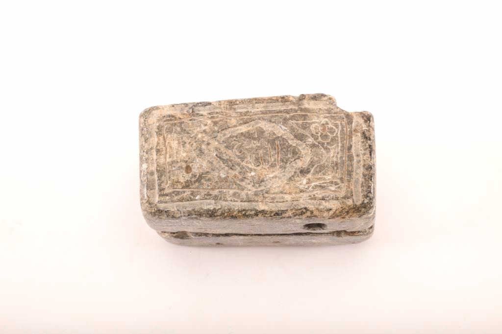 American Revolutionary war two piece stone bullet mold, approximately 3.5” x 2” x 2”; soapstone construction with carvings on top and bottom; soapstone is soft and easily cut; usual material utilized; all known specimens were made in two rectangular pieces; usually with pins to hold them in alignment when pouring lead. Rare! From the Robin Rapley Collection. Est.: $250-$500.