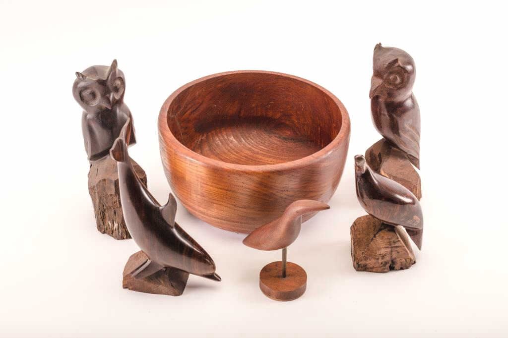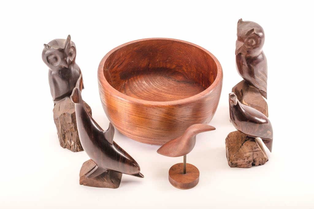 Lot of ironwood and other wood carvings including bowl (Shows breaks and repair). Old Laguna Beach collector. Est.: $150-$300