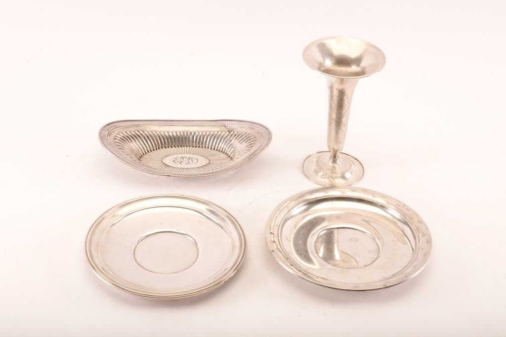 Victorian 1900s sterling pierced bowl with initials E.G.D. Vase signed Jenkins & Jenkins, Makers Baltimore. 1 Gorhan sterling silver plate. 1 sterling of same size. 4 pieces. Est.: $150-$300