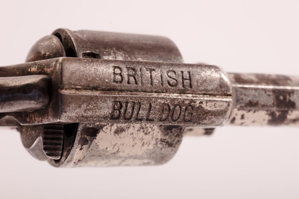 British Bulldog revolver, .32 caliber, Serial #NSNV. The pistol is in fair overall condition with a 2 ¼” barrel. The pistol retains a significant amount of its flaking nickel finish with light to moderate surfacerust on the frame and cylinder. The checkered wood grips are in fair condition with mars and flattening of the checkering. The bore is fair, the action functions and the markings are legible. Est.: $125-$250. (Antique).