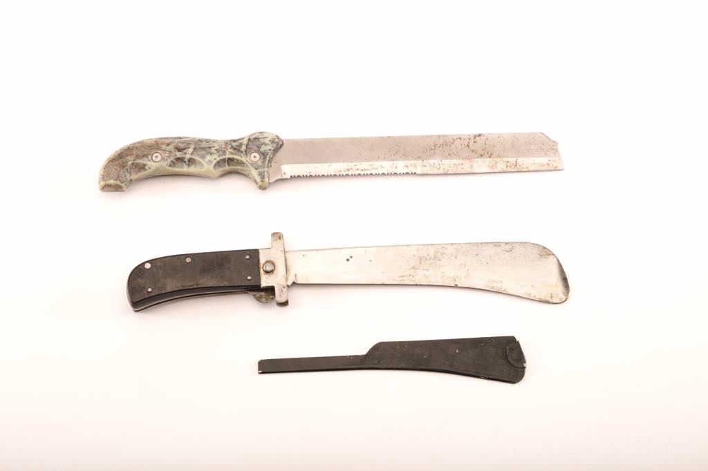 Lot of two knives. The lot includes a large Cattaraugus folder and Camillus Carnivore. The folder is in good overall condition, 15” in overall length with a 10” blade. The blade shows light surface rust and has beensharpened. The smooth plastic handle is in good condition with mars and scrapes from carry and use. The second knife is a Camillus Carnivore machete style knife with stacked synthetic camouflage handle and nylon scabbard in good condition. Est.: $100-$200.