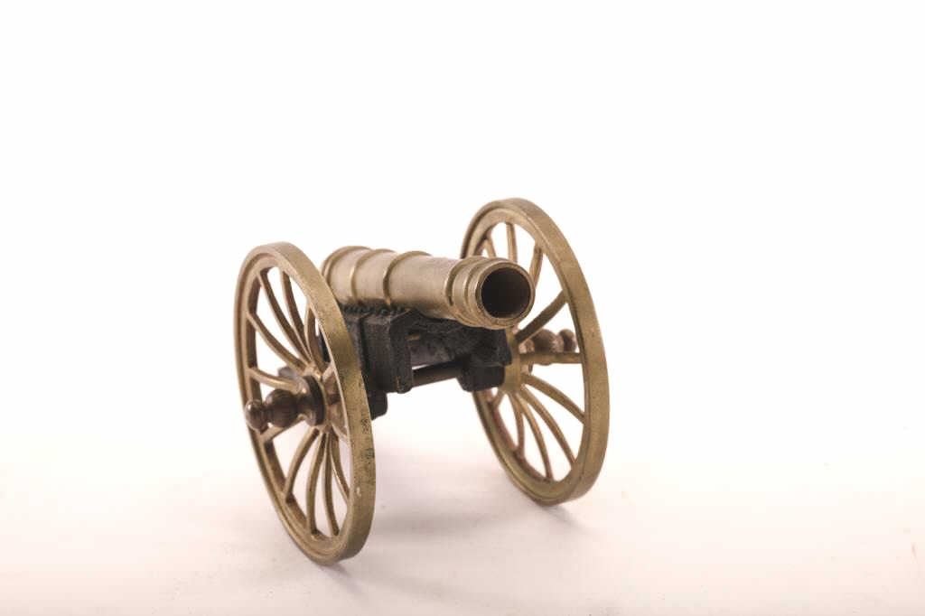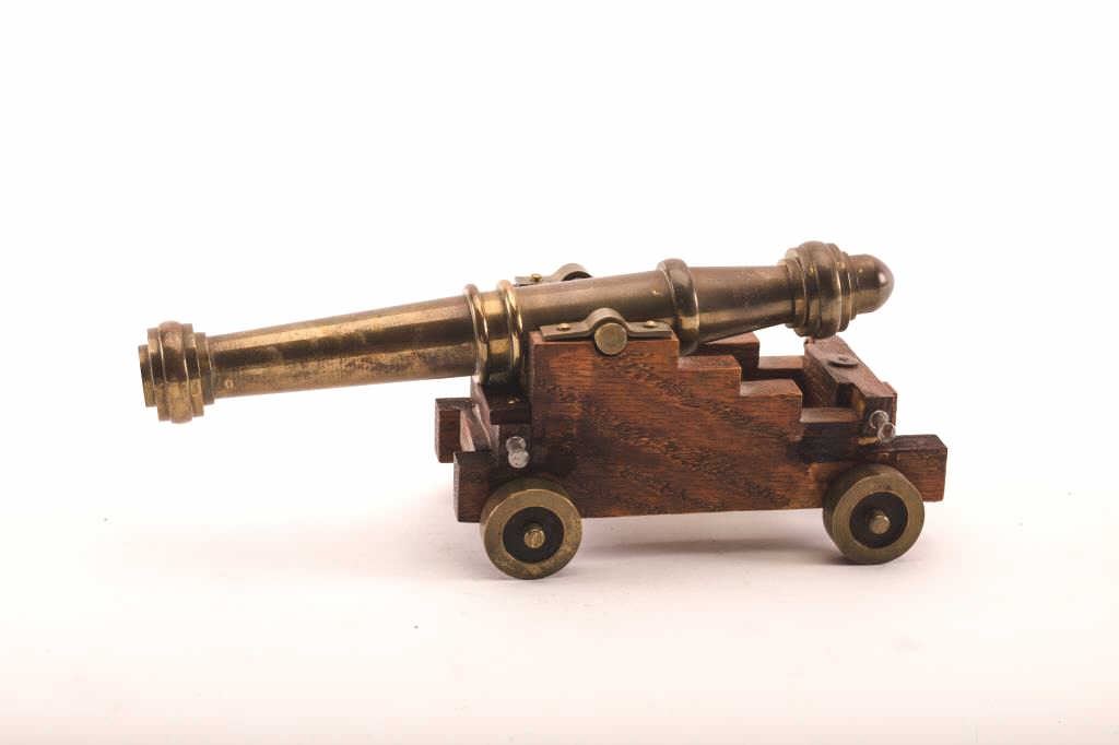 Lot of three small brass cannons. The lot includes: a cannon with a 10” black barrel with brass hardware and wooden carriage, a 9” brass barrel with wooden carriage and brass hardware and a third cannon with a 5” barrelwith cast carriage and brass wheels. All the cannons are in good overall condition. Est.: $100-$200.