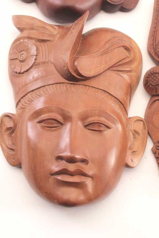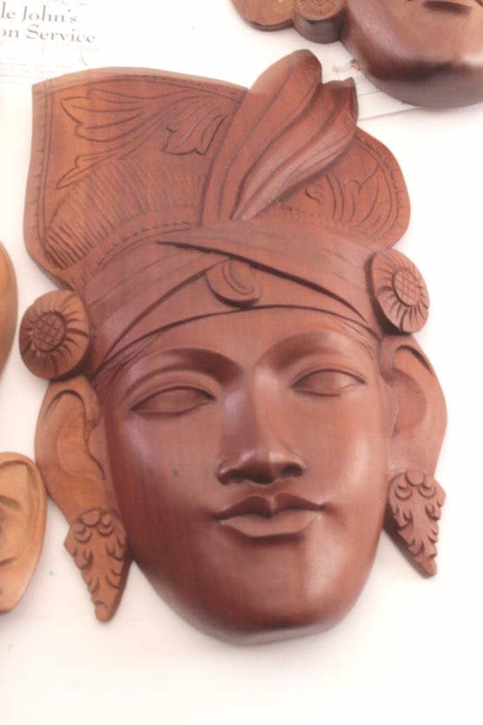 Lot of four hand carved Indonesian wall hangings depicting men’s and women’s faces. All four are approximately 9” to 10” in height with ornately carved faces with headdress and floral decorations.Beautifully carved on native hard wood and in very good condition. Est.: $100-$200.