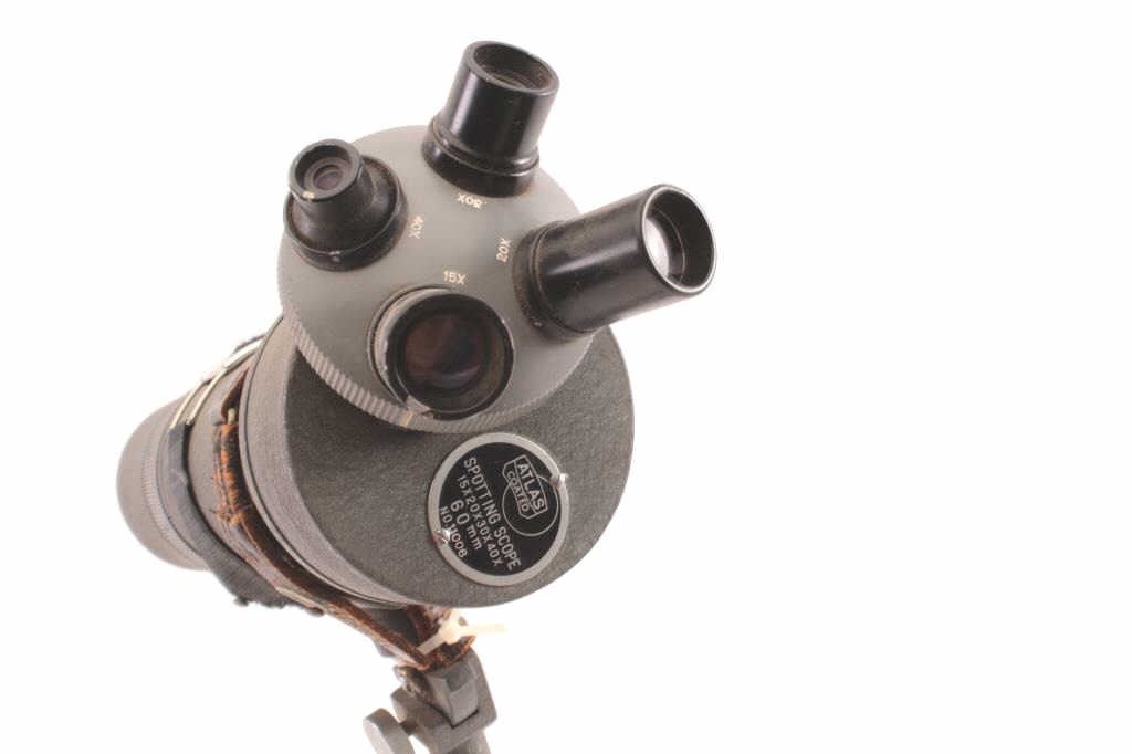 Atlas 15 x 20 x 30 x 40 x 60mm variable power spotting scope with tripod. The spotting scope is in good overall condition with an integral table top tripod. Est.: $100-$200.