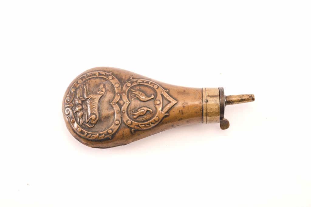 Dog flask for .36 caliber cap and ball generally found with Remingtons and other American Arms of same era. Some dents. 30%-40% lacquer. Good. Est.: $100-$200