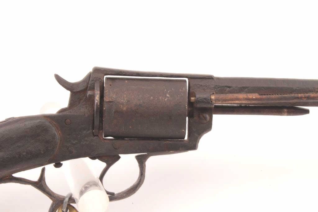 A rare 19th century European double action cartridge revolving rifle. An exhibit from the legendary J.M. Davis Firearms Museum in Claremont, Oklahoma bearing Davis Museum brass tag #9240 in relic condition. 26 inchbarrel and 43” overall. Walnut butt with relief carved deer at the wrist. 40 caliber octagonal to round barrel. A great display piece for any Old West gunroom and wall of oddities. Est.: $400-$700