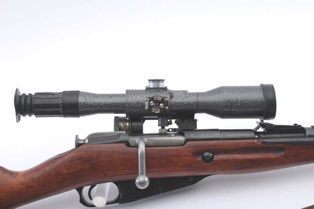Russian Mosin-Nagant M44 bolt action sniper rifle, 7.62 x 54R caliber, Serial #B82306. The rifle is in very good overall condition with a 23” barrel with a hooded front sight and muzzle break. The metal surfaces retainthe majority of their military finish with a tangent style rear sight and folding bayonet. The rifle shows all matching visible serial numbers and an import mark on the left side of the receiver. A side mount andrings has been added during the period of use and an Inter Ordnance 8 x 42 fixed power rifle scope added. The scope is in good condition marked made in Belarus, Serial #0201395. According to the consignor, thesniper rifle was made for the Russian Forestry Service. The smooth wood stock is in good condition mars and compressions consistent with service use. The butt stock ends with a rubber recoil pad. The bore isgood, the action is crisp and the markings are sharp. A leather military style rifle is included. Est.: $350-$700. (C+R).