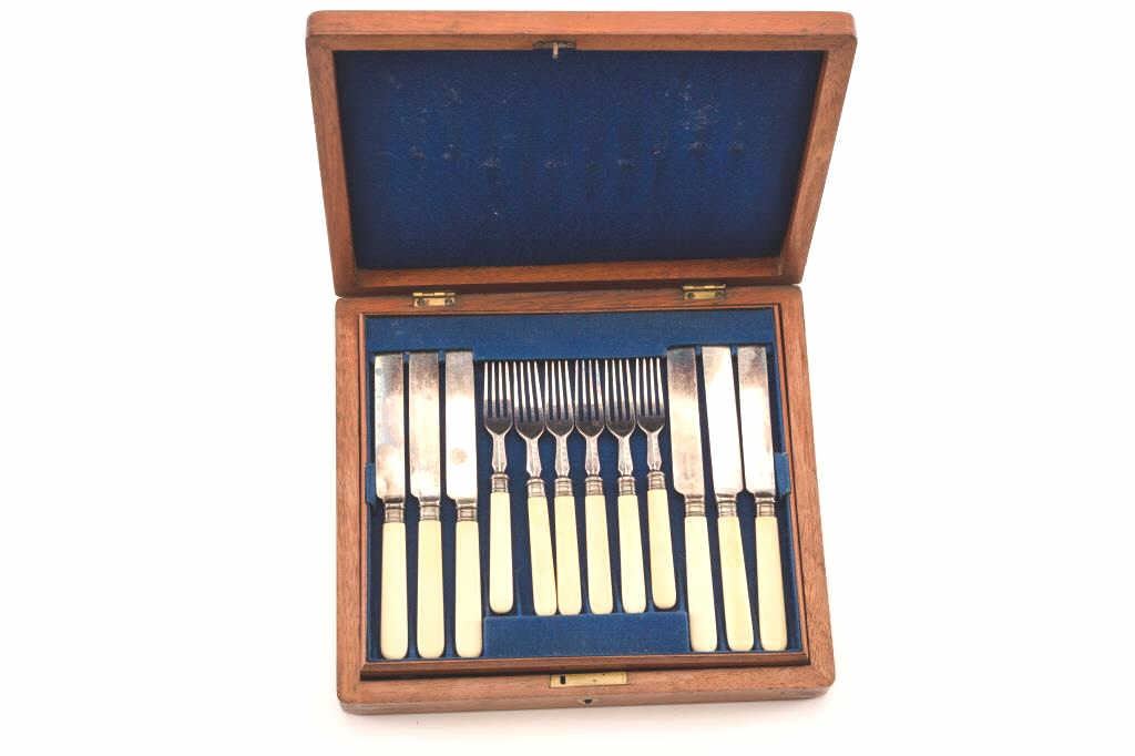 Antique silver and mother of pearl fish service for 12 in fine condition hallmarked in wooden box Est:$500-1000