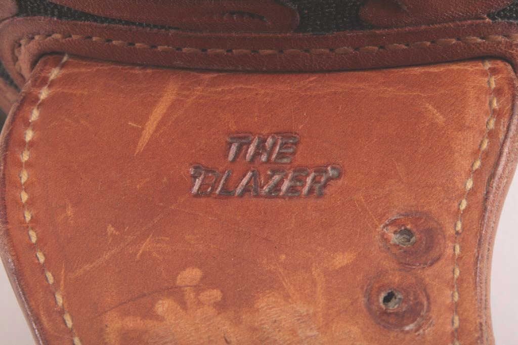 Vintage fast draw holster for 4 ¾” Colt Single Action marked “The Blazer”. Carved two tone leather. Size 34-36. Very good to fine condition. Est.: $150-$300