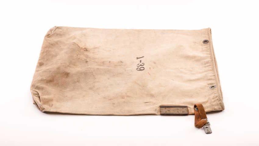 U.S. Mail bag for train use “1-39” (WWII Era). Used in studio productions. Measures 28” x 23”. Heavy canvas. Est.: $75-$150