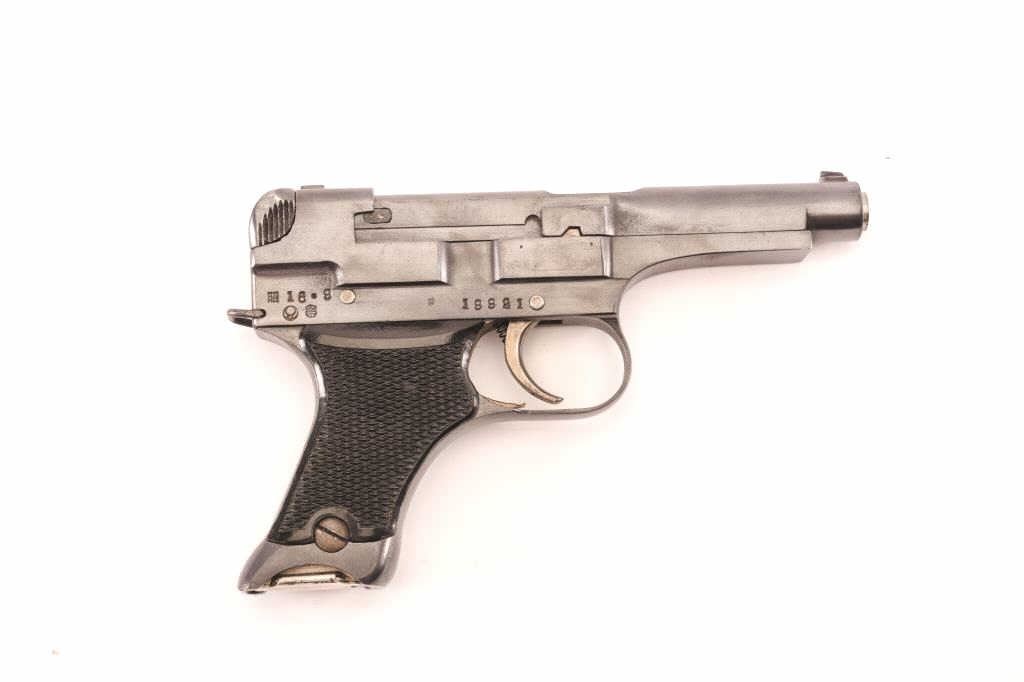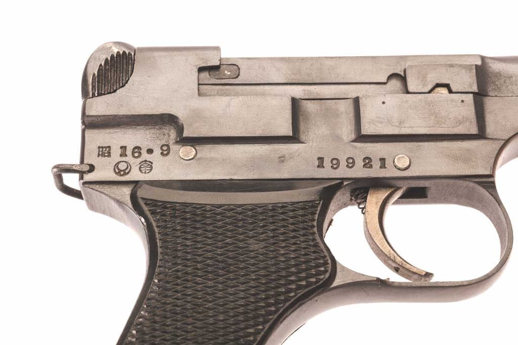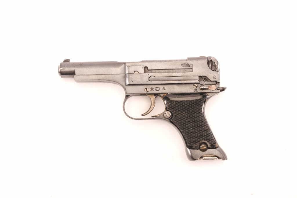Japanese Type 94 8mm Semi-Auto pistol, S/N 19921 dated 16.9 with matching nickel plated mag in original near fine condition. Excellent bore. 97%-99% original finish. Small chip from top of left grip top. A 9.5on a 1-10 scale. Hard to improve upon. (C&R/PPT) Est.: $350-$700
