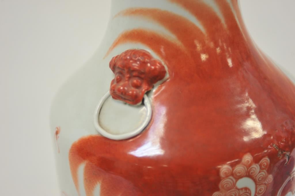 Large decorated Chinese porcelain vase, approximately 23” in height and displaying vibrant red colored deities with extensive Chinese characters on one side of the vase; bottom of vase has Chinese marking too.Est.: $300-$500.