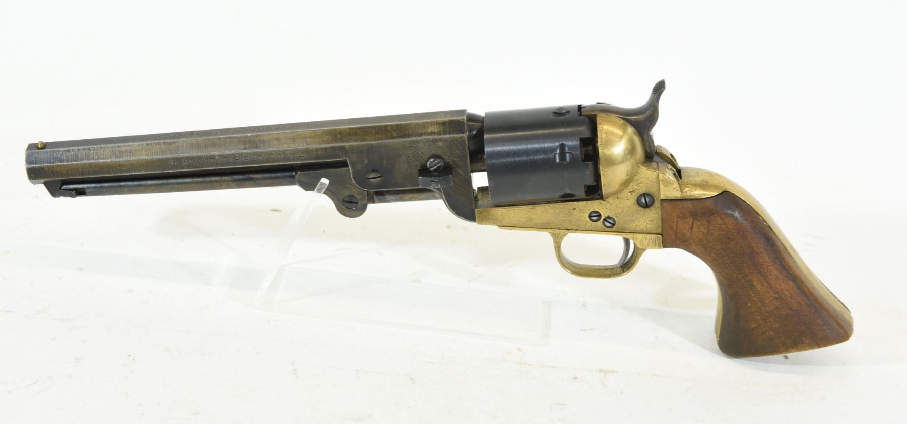 Restricted, revolver, 36 Percussion, 190mm barrel, SN 254486. Wood grips have a few marks, bluing is grey, bore has pitting.