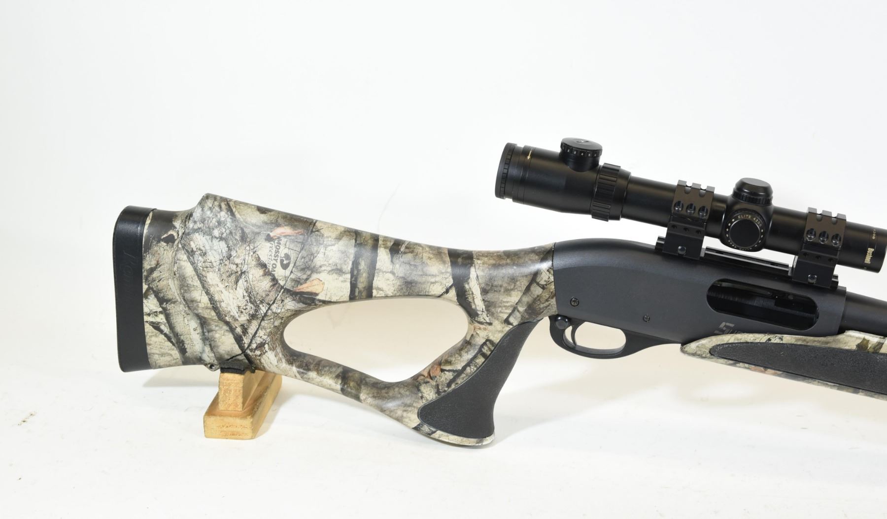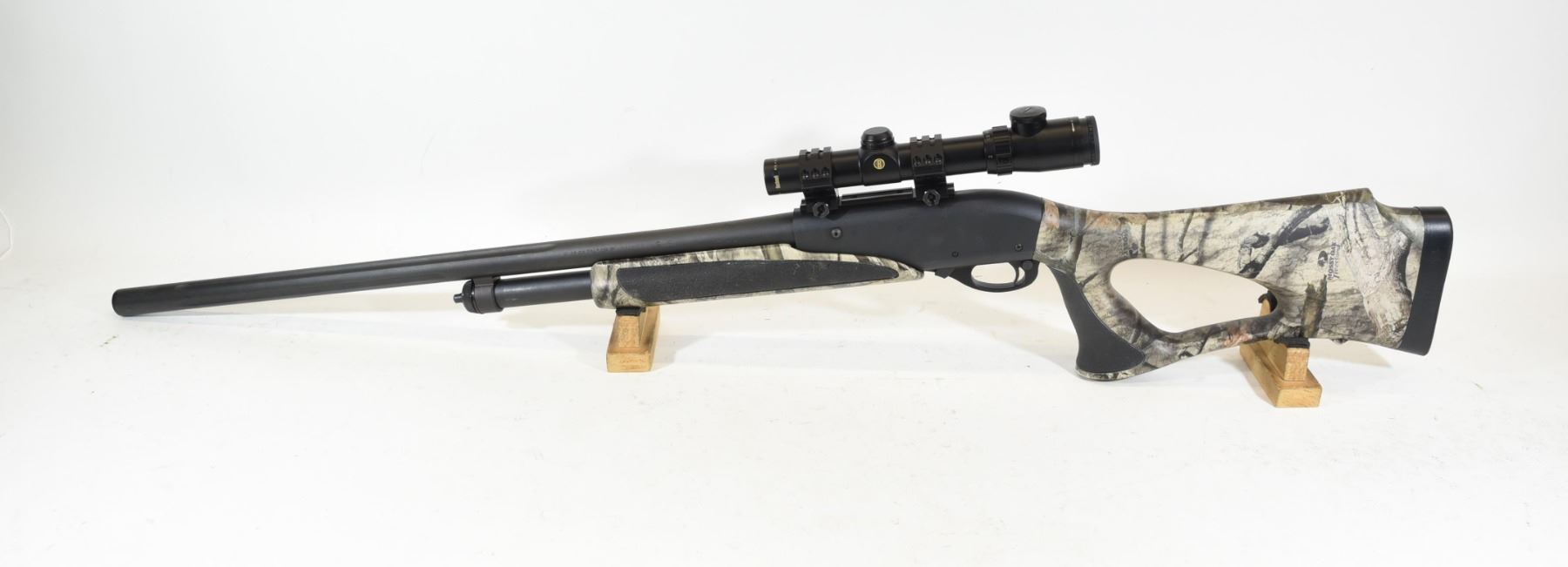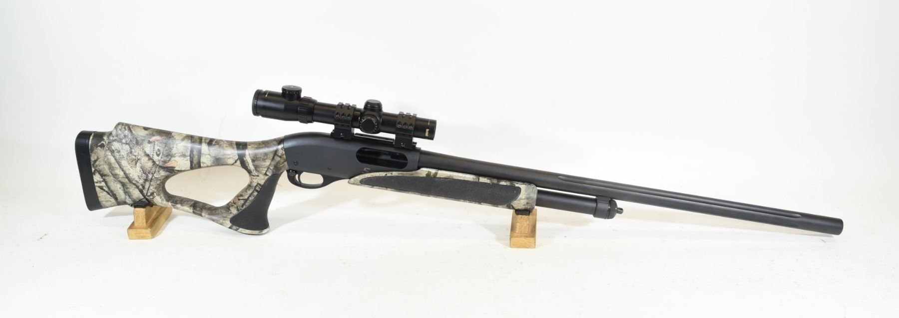 Non-restricted, pump action, 12Ga x 3", 25 1/2" fluted rifled barrel, SN RS13612D. Sureshot stock excellent, bluing has a mark from forearm, bore excellent. Comes with Bushnell Elite 4200 1.25-4 x 25 scope.