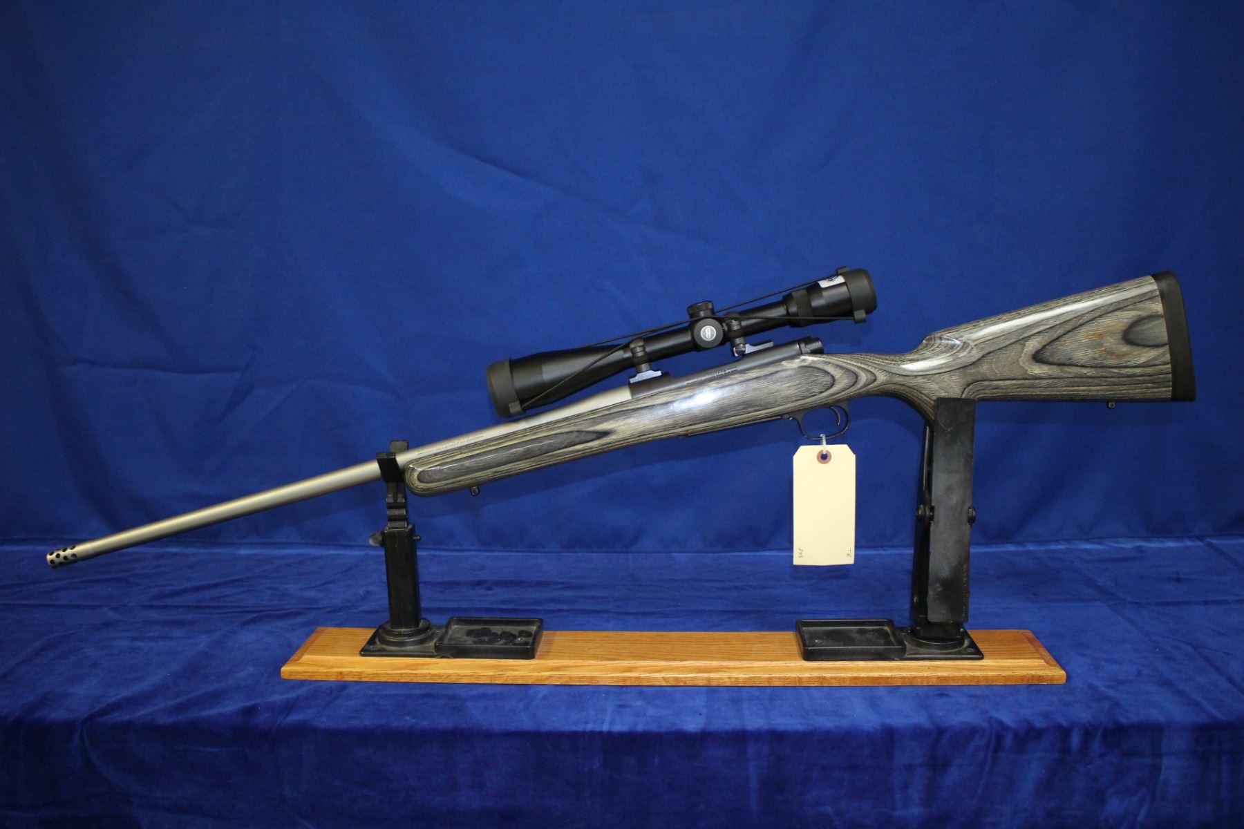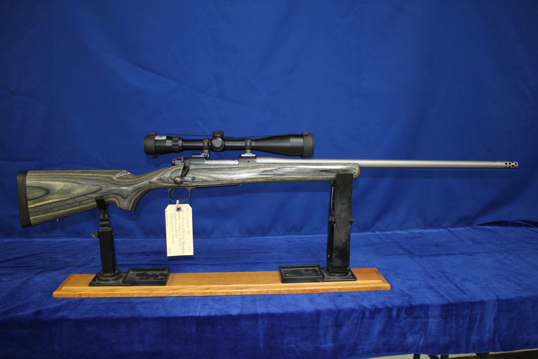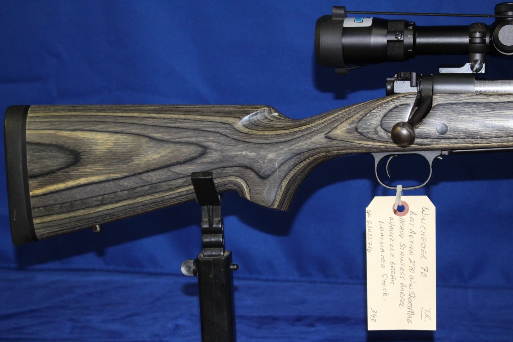 270 Winchester Short Mag; Bolt Action; 26" Heavy Stainless Barrel w/Muzzle Break; Bore is like new; Bushnell Scope (4-5-14); Laminated Stock; S/N G3022738