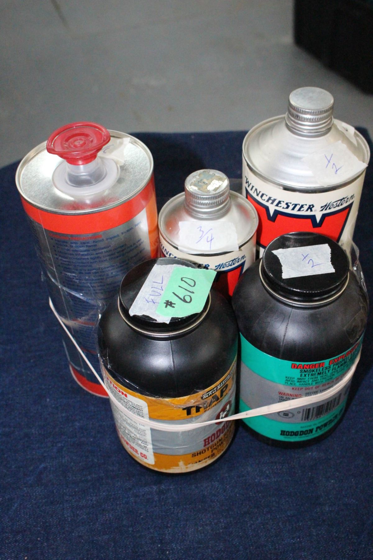 (1 Full Tin) Hodgon Trap 100 Shotgun/Handgun Pwdr; (1 - 1/2 Tin) Hodgon Smokeless Propellant #H4895; (1 - 1/2 Tin) Winchester Ball Pwder #231; (1 - 3/4 Tin) Winchester Ball Pwder #748 & (1 - 3/4 Tin) Hercules Smokeless Pistol Powder - no #