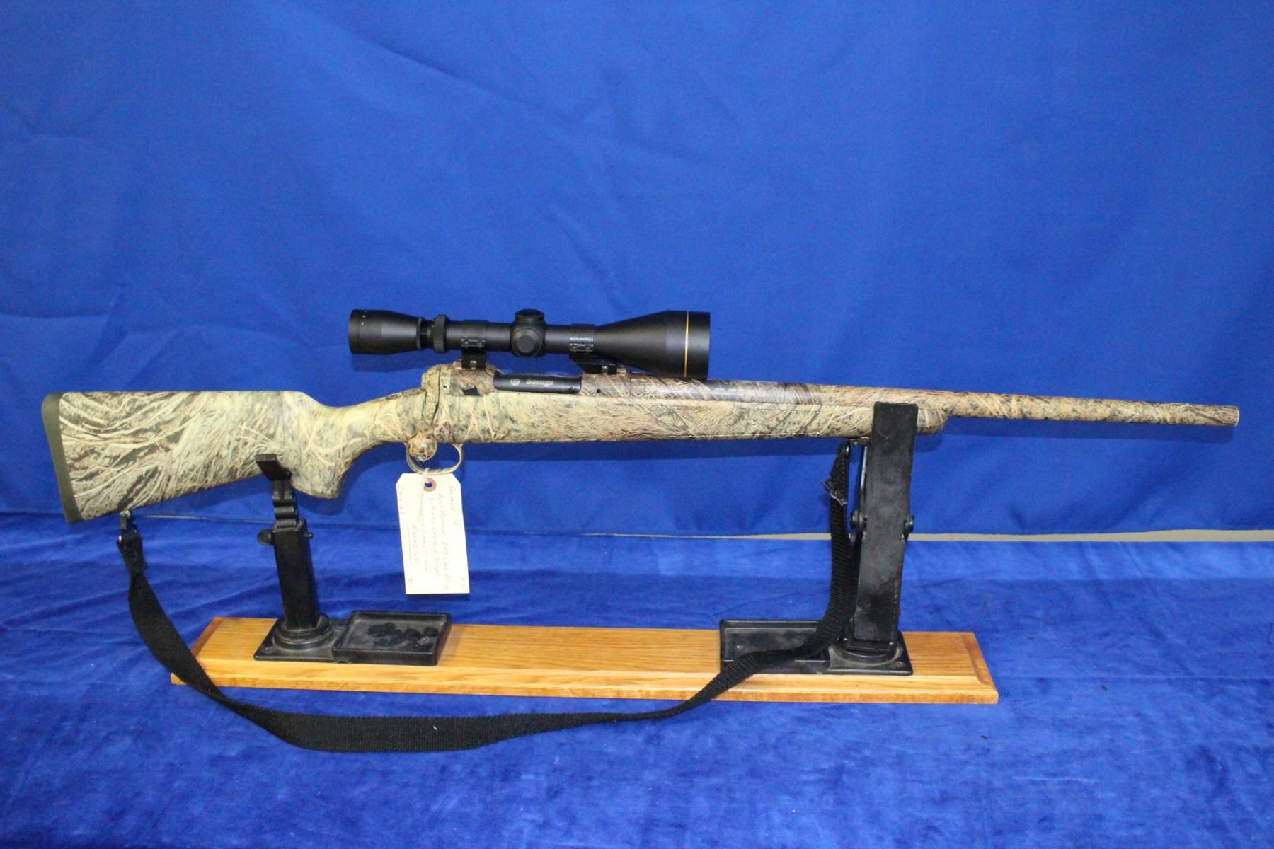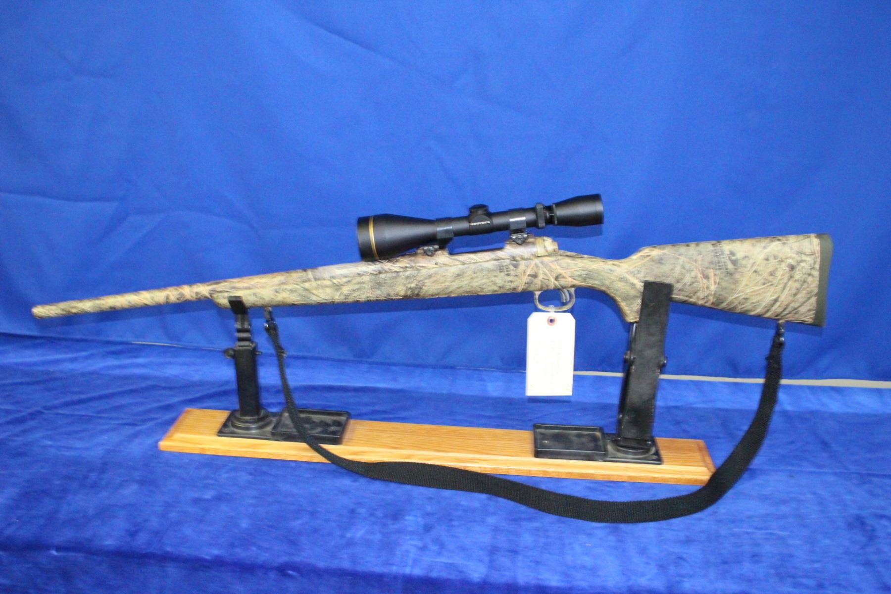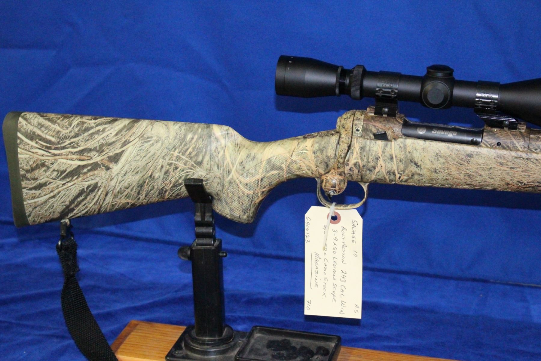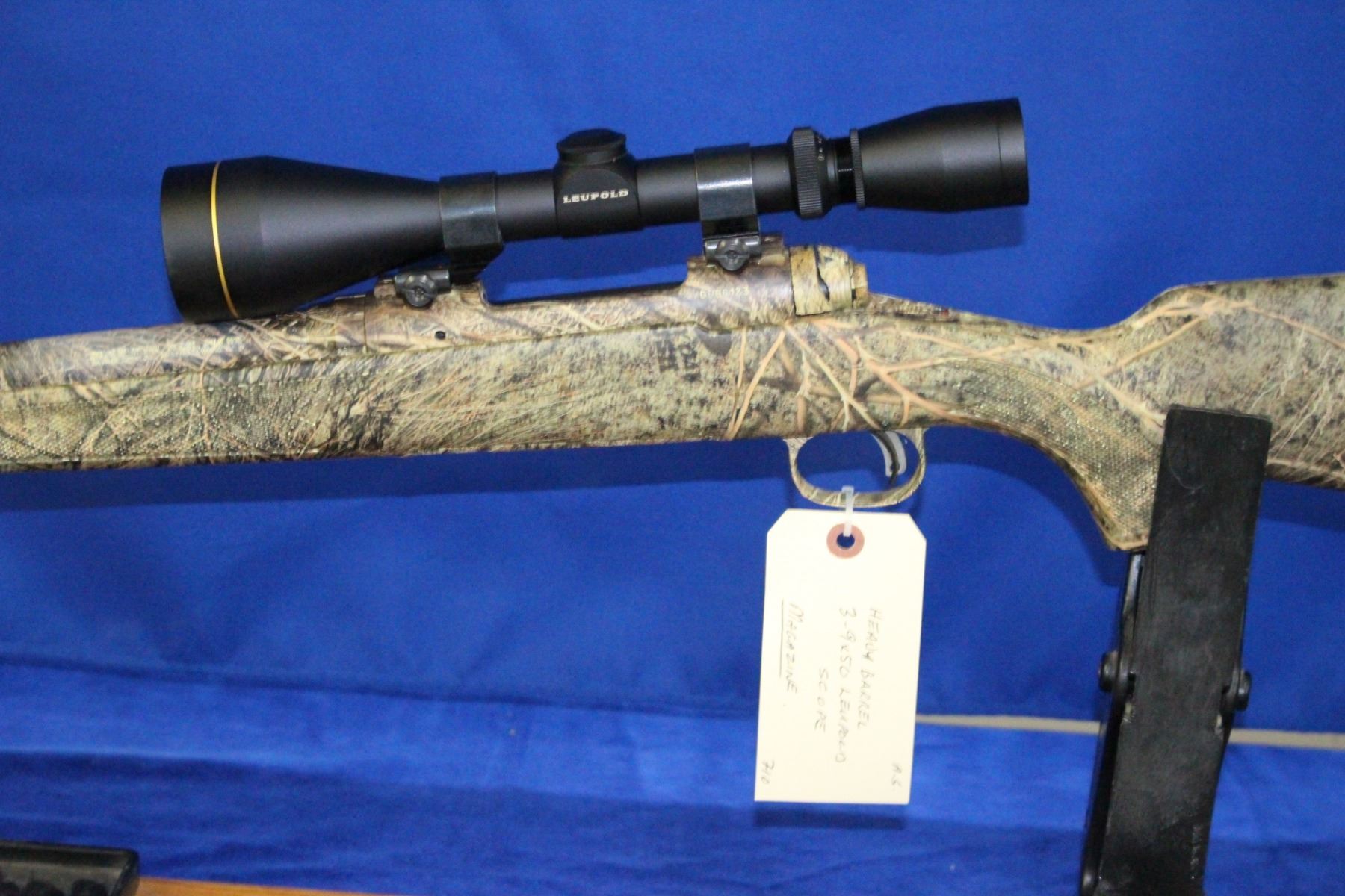 243 cal.; Bolt Action; Camo Synthetic Stock; 22" Heavy Barrel; Good, clean bore; w/Magazine & 3-9x50 Leupold Scope