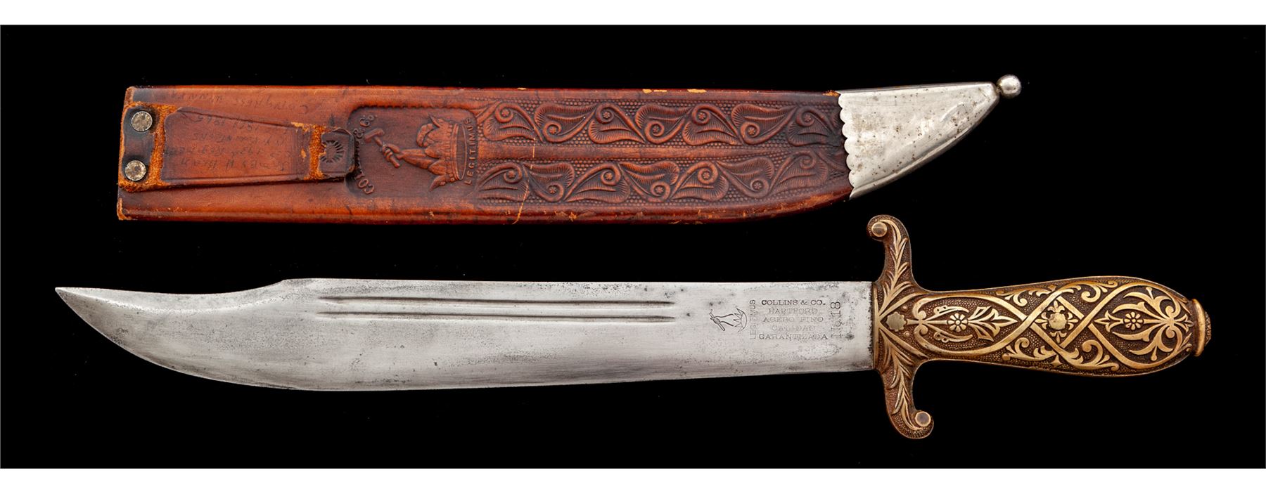 Collins No. 18 Bowie/Machete in Sheath, with Civil War markings to N.Y. Regiment and decorative brass handle. The 11.75'' blade has a double fuller on both sides and is marked at the ricasso area with the Collins Legitimus arm and hammer stamp. Also stamped ''Collins & Co. Hartford, Acero Fino, Calidad, Garantizada, No.18''. Brass handle is beautifully decorated with raised lines and floral decorations. Blade is bright with very light scattered pinprick pitting, mainly on one side. Overall length is 18.25''. Leather Collins sheath is stamped with the Collins & Co. Legitimus logo and has impressed floral decorations. These fancy brass handles were fitted on No. 18 blades around 1877 to the 1890's, with the last catalogue showing them in 1904. Silver color-plated metal tip on bottom of sheath. Top of sheath has light writing of ''James H. Bean, Co(?) 193th Regiment, N.Y. Volunteers Inf. 1861-1865, Congress Winner''. Includes information from the National Archives showing James H. Bean in the 193rd New York Infantry. Est.: $750-$1,500.
