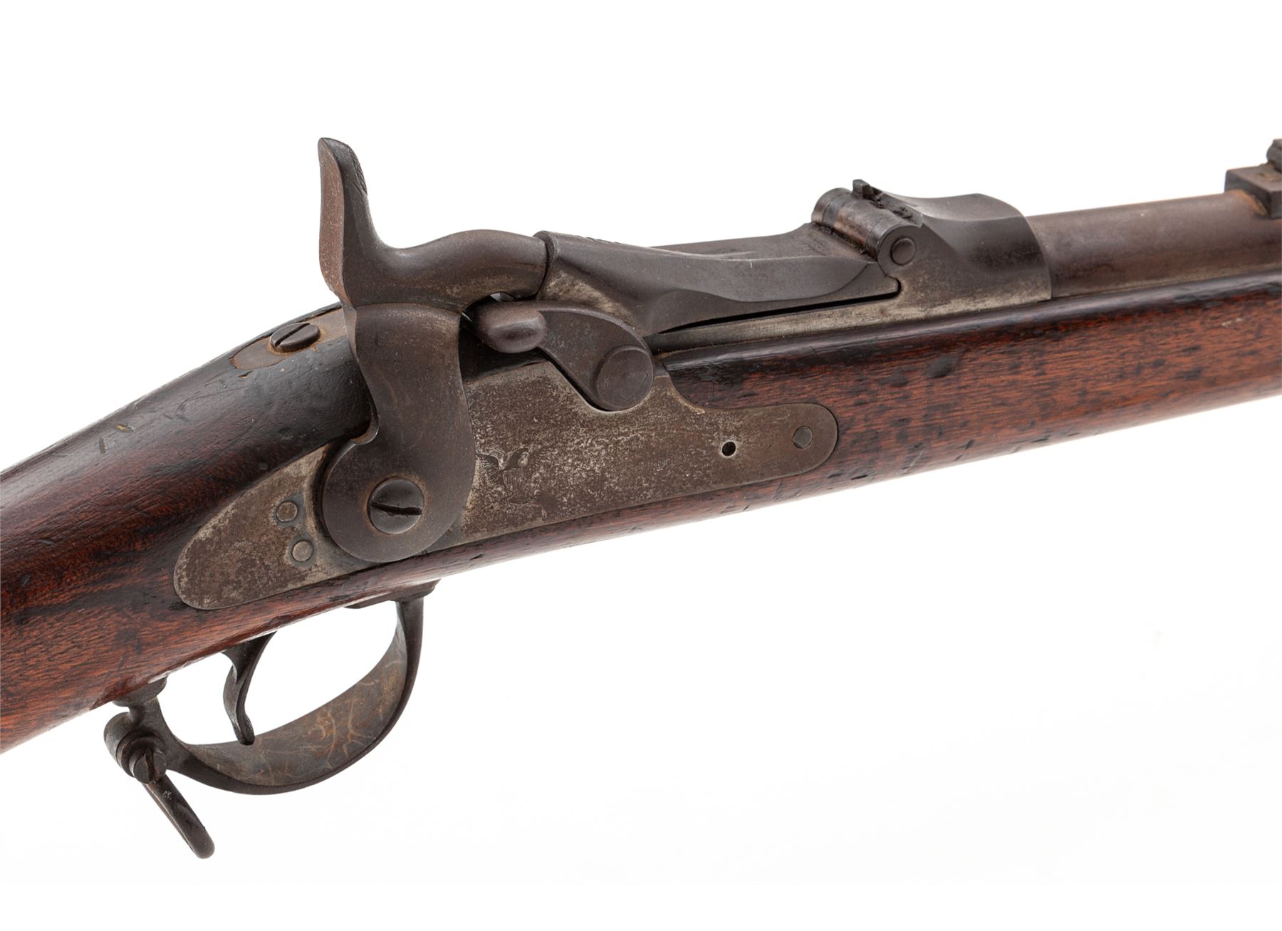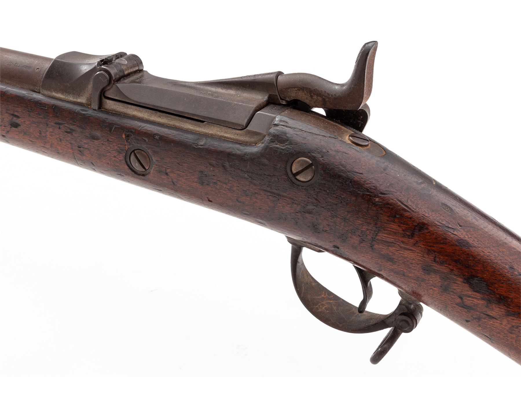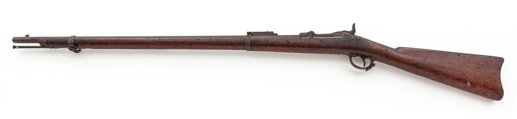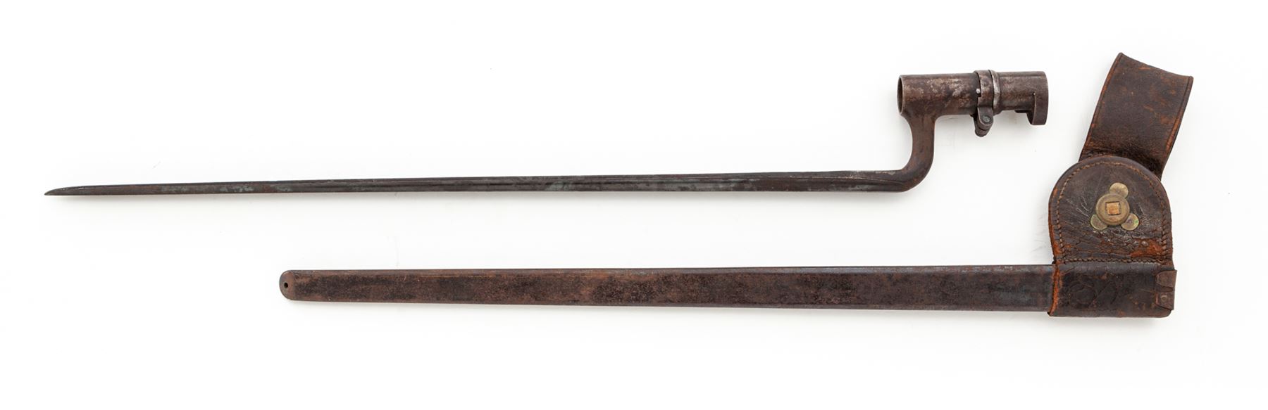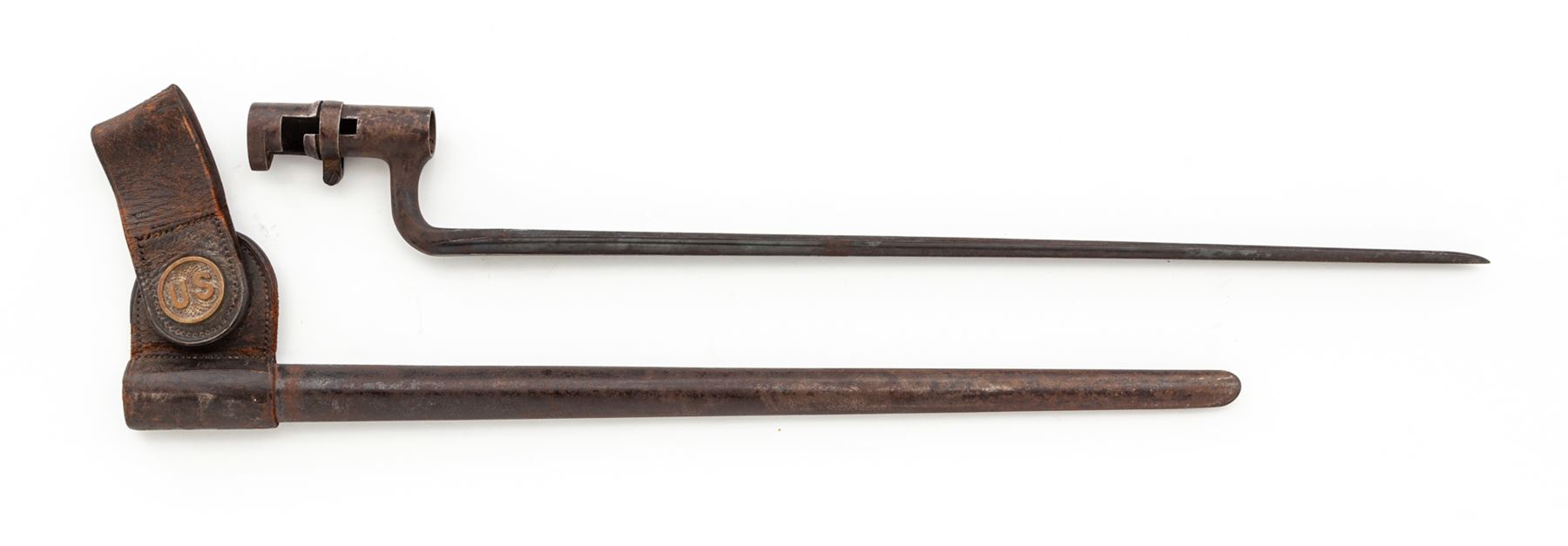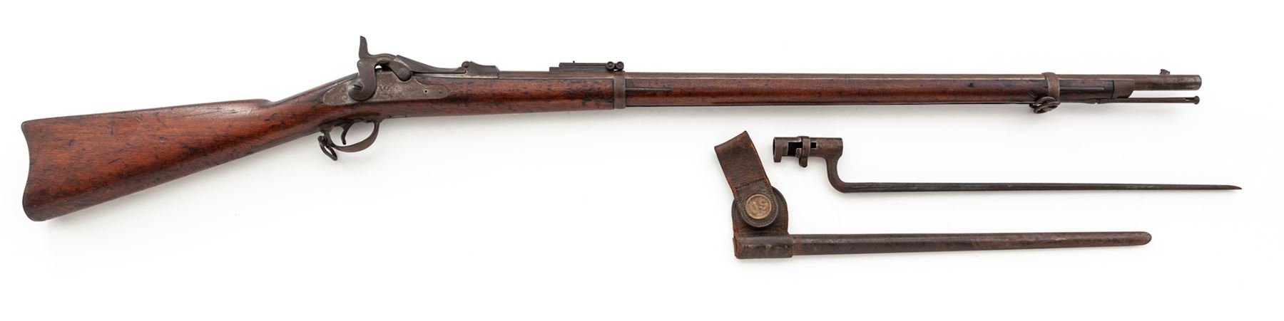 U.S. Springfield Model 1884 Single Shot Trapdoor Military Rifle, with bayonet and scabbard, #447688, .45-70 CF cal., 32-5/8'' round barrel (measured from muzzle to breech face) marked ''V/P/(eaglehead)'' at breech and fitted with the standard block-blade front sight (which doubles as bayonet lug) and correct ''R''-marked Buffington adjustable leaf rifle rear sight; trapdoor marked ''U.S/Model/1884'' in three lines at hinge; flat lockplate marked ''U.S./Springfield'' in two lines (obscured) ahead of a detailed spread-eagle holding olive branches; steel furniture including two spring-retained barrel bands (top band with sling swivel), triggerguard having a long rear tang and a sling swivel, ''US'' marked buttplate, and slotted button-head ramrod. One-piece walnut rifle fullstock. Originally finished with blued barrel and lockplate, case hardened trapdoor and oil-finished stock. Mfg'd 1886-91. Condition is good to very good, having a thin rusty-brown patina to metal; trapdoor with bright case hardening colors on underside. Stock with moderate dings and scars from military use. Overall the gun is sound, complete and original as issued and will improve greatly with a careful cleaning. Action is very tight and crisp; bore is clean and shiny with distinct rifling. Bayonet retains approx. 35% bright blue marred by scattered rust pitting; scabbard matches with leather parts having age cracking to the finish mainly on backside. Est.: $600-$800. (Antique)