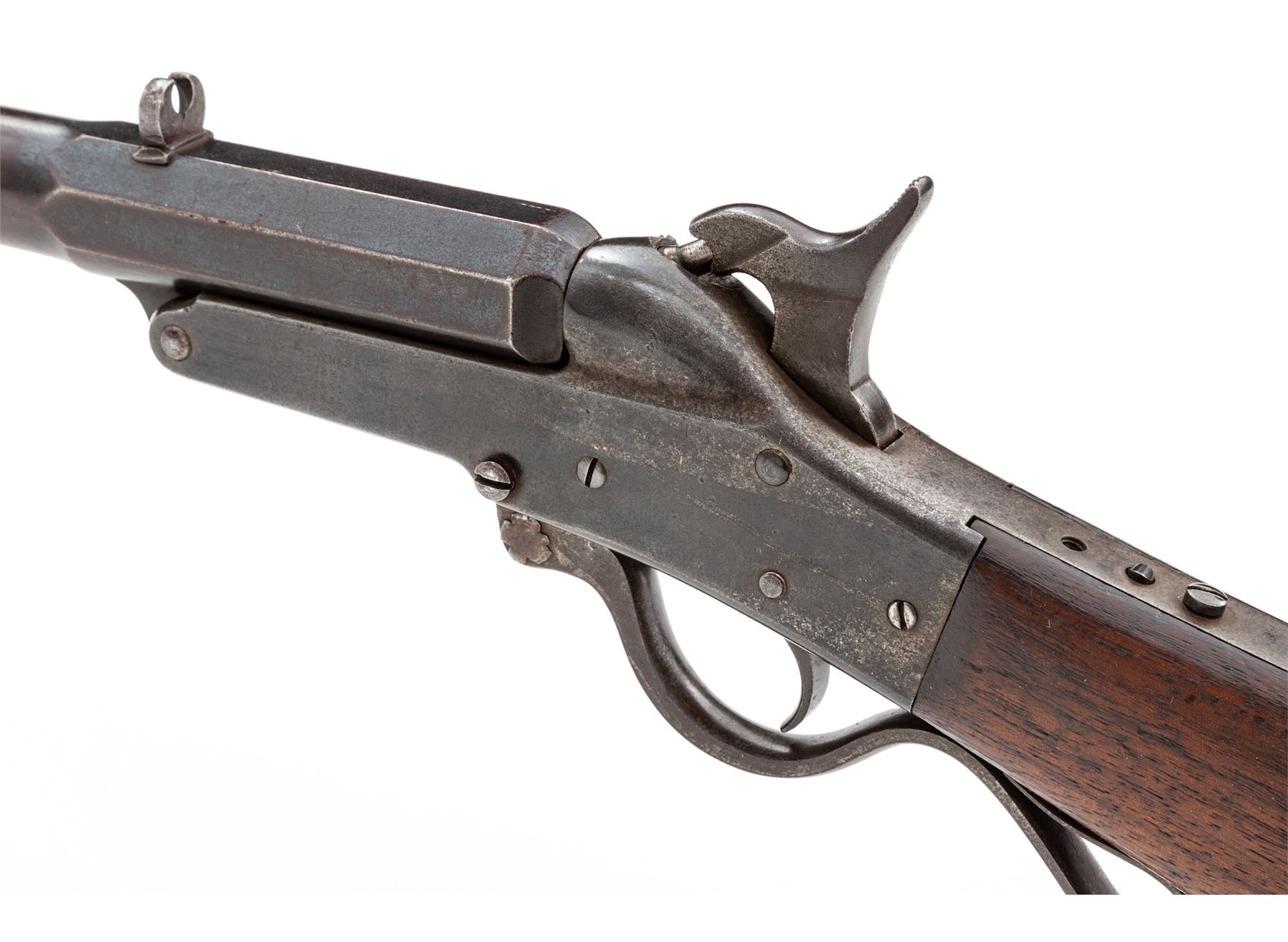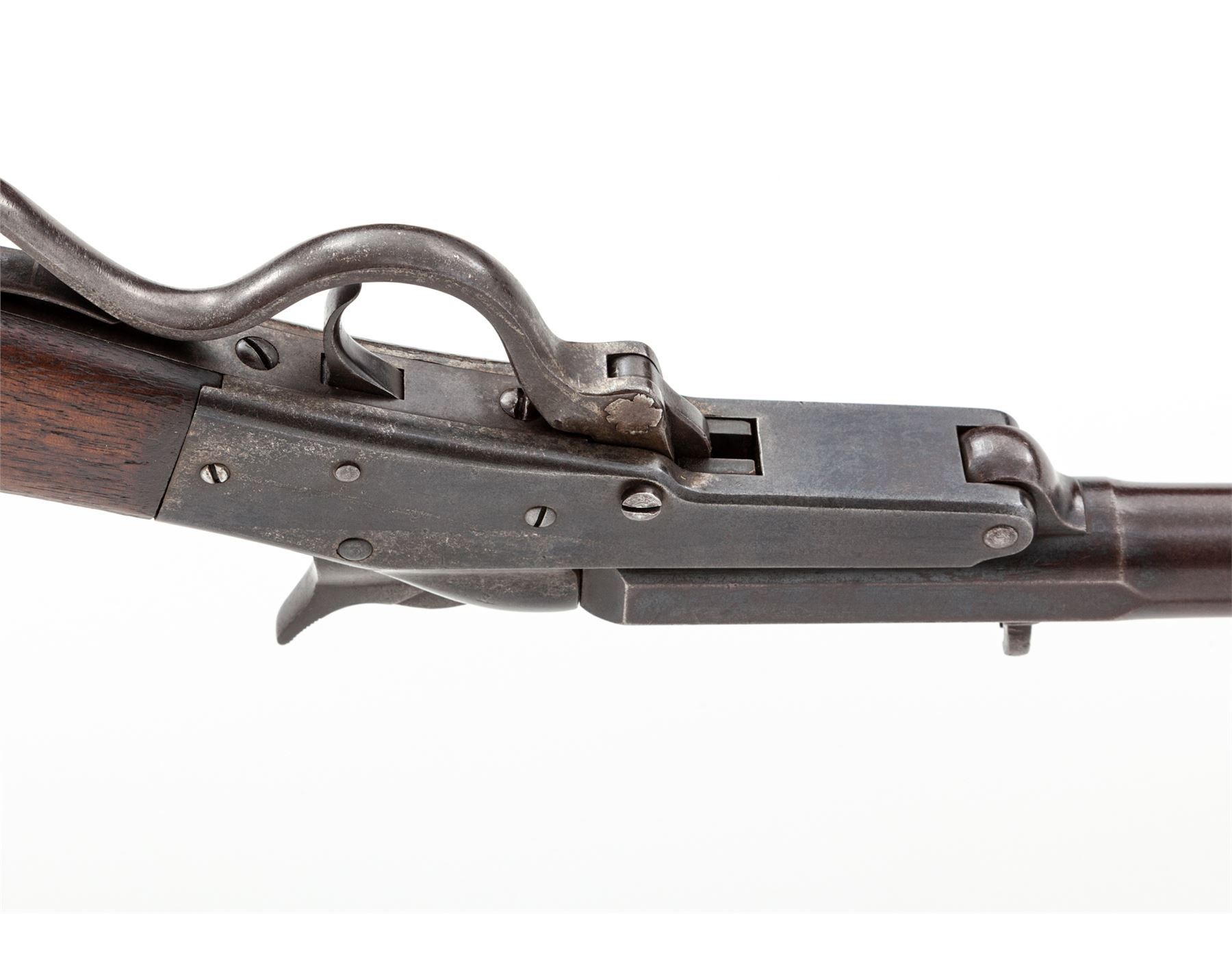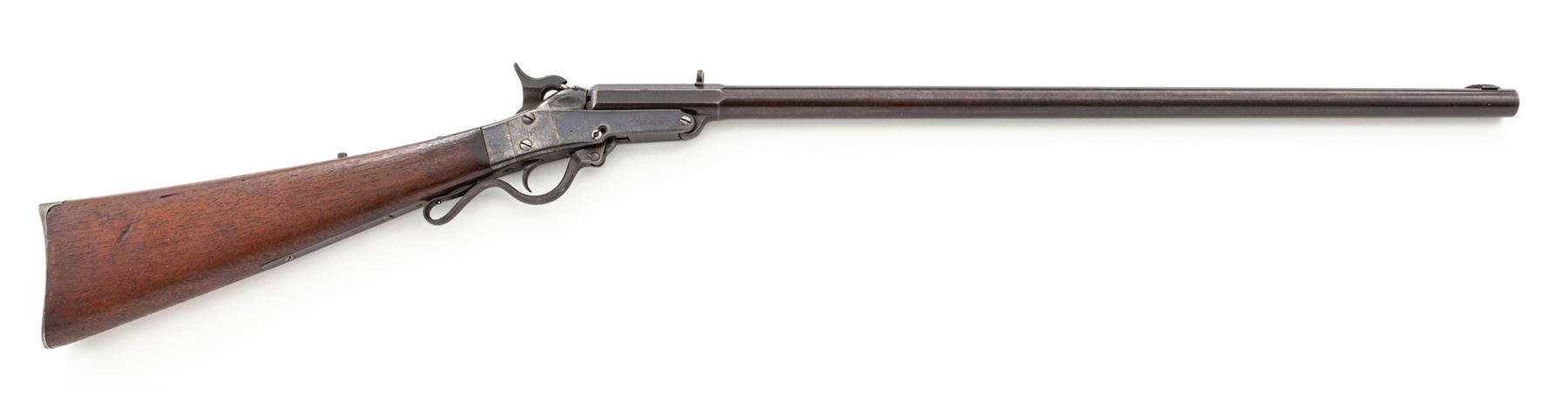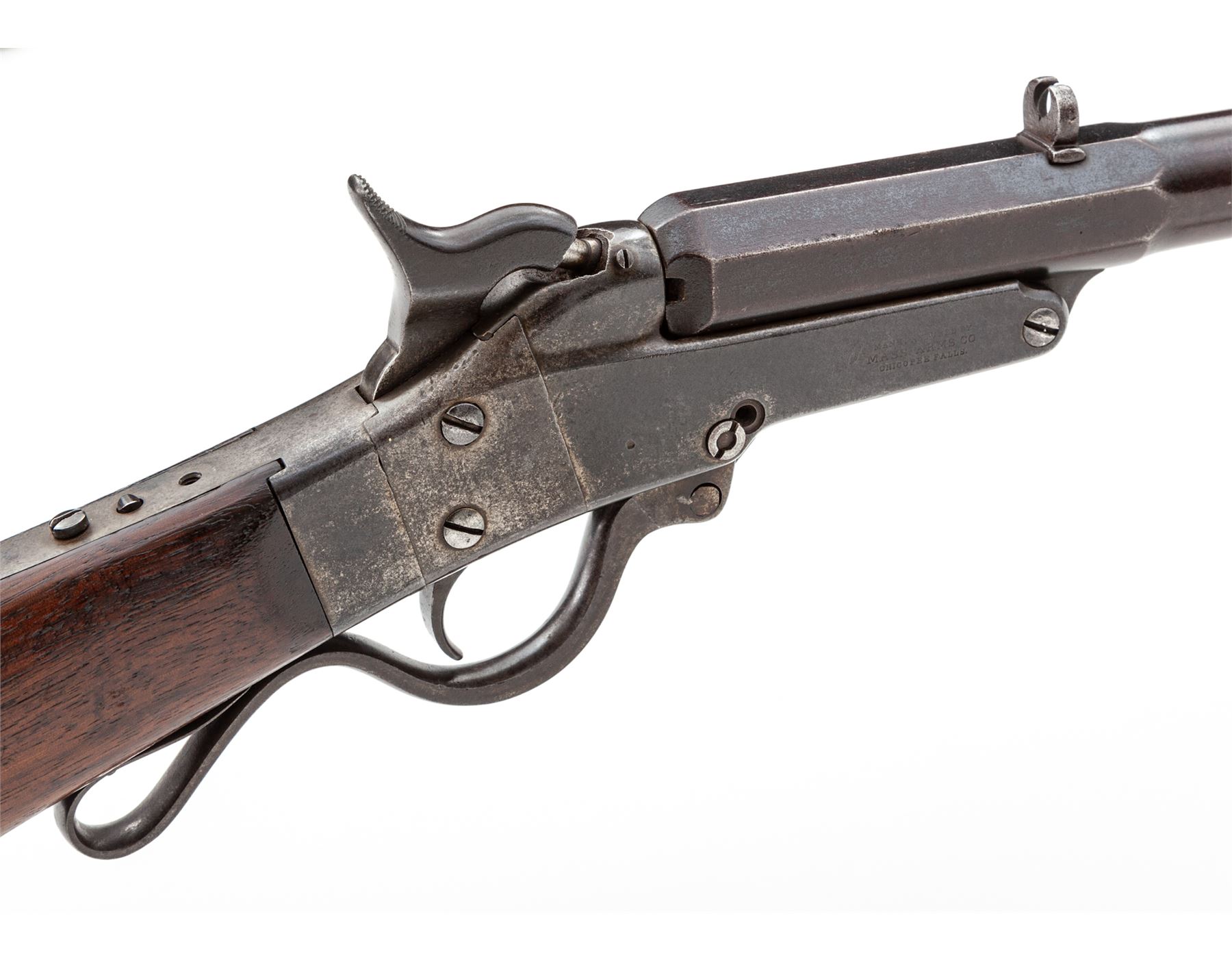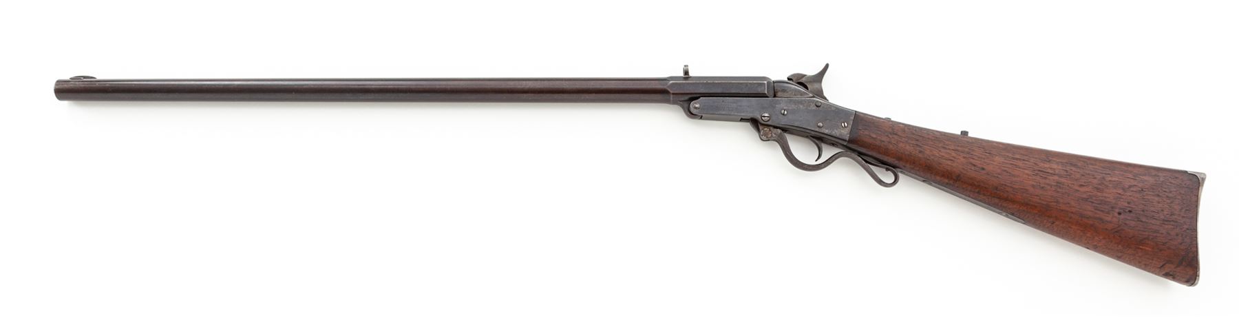 Maynard's Patent Single Shot Model 1873 ''Improved Hunting or Target No. 9'' Rifle, #5888, .40-40 CF cal., 26'' octagonal-to-round blued barrel with dovetailed low blade front sight and open rear sight; case hardened steel receiver marked on left side ''Edward Maynard/Patentee/May 27, 1851/Dec 6, 1859'' in four lines, and ''Manufactured by/Mass. Arms Co. Chicopee Falls.'' on right; serpentine operating lever opens the breech; extended lower frame tang; rifle style buttplate. Condition is very good, the barrel retaining approx. 10% original blue mostly confined to the rear octagonal section, the rest a smooth blue-brown patina; receiver with silvered/darkened case hardening, missing tang peep sight, and with an old peened repair at left side of lever pin. Buttstock showing minor age/use wear but smooth and sound. Action is sure and smooth; the bore is dirty but with deep rifling and should clean up well. Est.: $750-$1,000. (Antique)