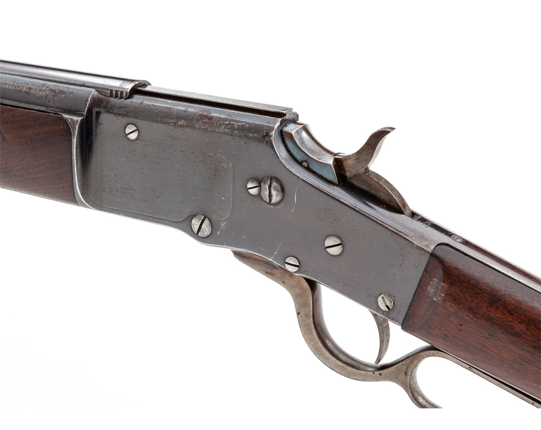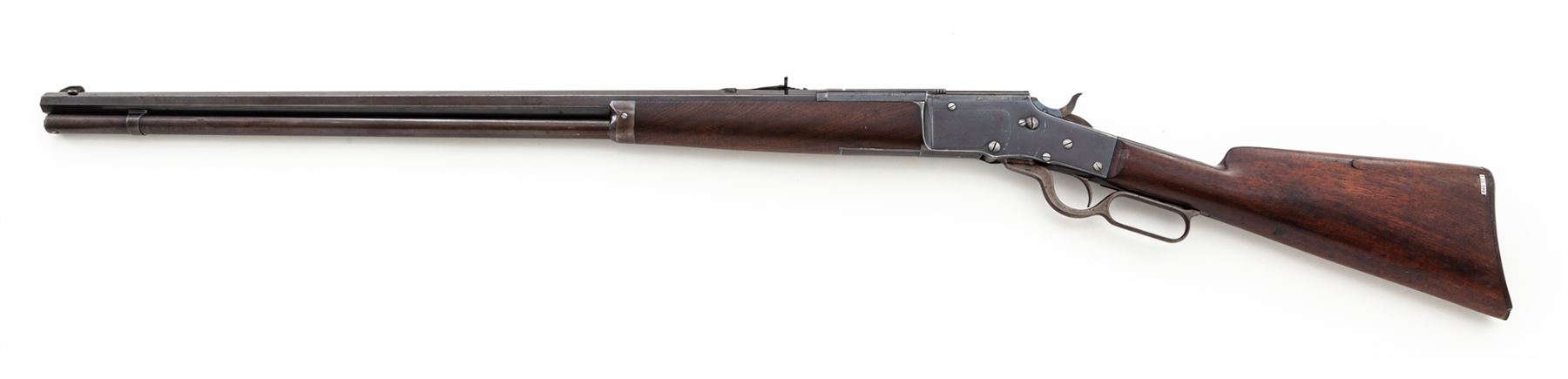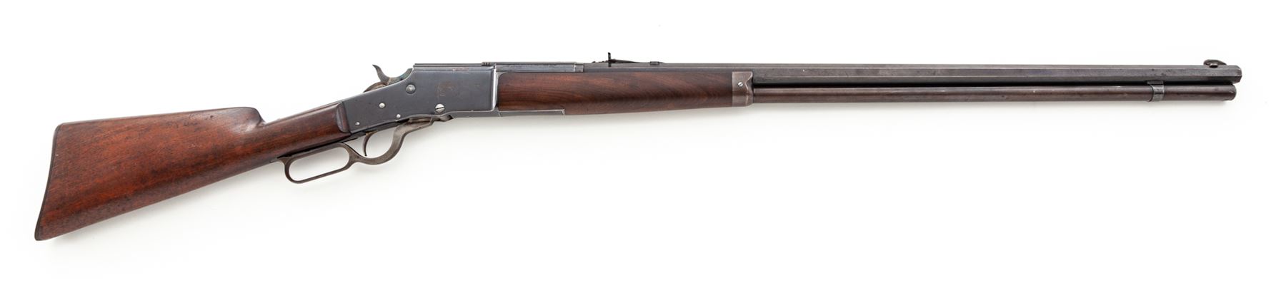 Bullard Large Frame Repeating Lever Action Sporting Rifle, #1264, .40 CF cal., blued 28'' octagonal barrel (measured from muzzle to face of chamber) marked only ''Cal/40'' ahead of breech with dovetailed Rocky Mountain front sight and adjustable ramp open rear sight; full-length under-barrel blued tubular magazine; blued receiver marked on left side below top ejection port ''Bullard Repeating Arms Company/Springfield Mass. U.S.A. Pat. Aug. 16, 1881'' in two lines and with blued sliding dustcover; case hardened operating lever, hammer, and trigger; varnished walnut forend with blued nose cap and buttstock, with gutta percha buttplate having the ''Bullard/Rept'g. Arms Co'' encircled elk logo within a checkered background. Includes a copy of the book ''Bullard Arms'', by G. Scott Jamieson, along with a hand signed letter from the author. Mfg'd 1886-90. Overall condition is near excellent. Barrel retains approx. 90% thinning and toning original blue, receiver and dustcover having 95% deep blue with one swirled area in finish on right side; cartridge tube and nose cap retain much original blue in protected areas but are mostly a soft muted blue-brown patina; lever, hammer and trigger with muted case hardening colors. Stocks are smooth and sound, having a ''C''-shaped ding on left buttstock and a soft satiny finish; gutta percha buttplate with sharp checkering and relief details and one chip out at toe. Rifle has clear markings and crisp edges throughout. Sometimes known as the Model 1886 Rifle, this patented rack-and-pinion action by James Bullard (formerly a mechanic with Smith & Wesson and a prolific inventor) was the smoothest and quietest of the lever actions, and produced great leverage for seating and extracting cartridges. Action is silky smooth; bore shines with deep rifling. Est.: $5,000-$7,500. (Antique)