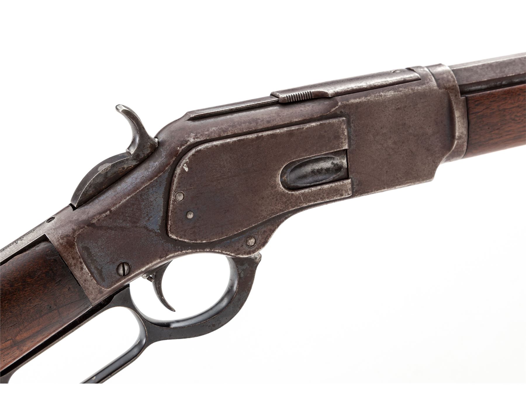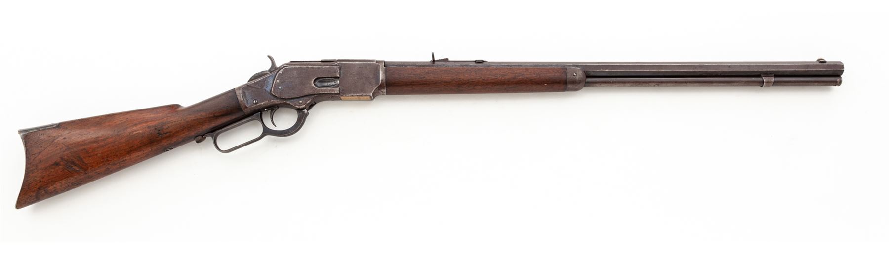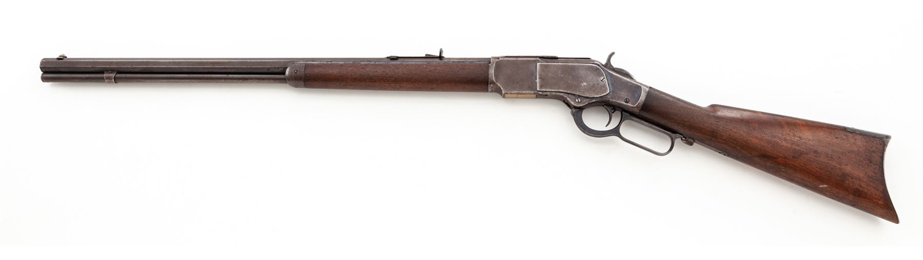 Antique Winchester Model 1873 3rd Type Lever Action Repeating Cartridge Rifle, #241493, .32 WCF cal., 24'' blued octagonal barrel with dovetailed German silver small blade front and adjustable buckhorn sporting rear sights is marked on top flat ''Winchester's Repeating Arms, New Haven, Conn. U.S.A./King's-Improvement-Patented-March 29, 1856, October 16, 1860'' in two lines, and ''32 W.C.F.'' just ahead of juncture with blued steel receiver, which is marked ''Model 1873'' within fancy brackets on top tang and the serial number on lower tang; blued sliding dustcover over top cartridge ejection port; brass cartridge elevator is marked ''32 Cal'' on bottom; full-length blued tubular cartridge magazine; blued steel nosecap and crescent buttplate on varnished walnut forend and buttstock. Mfg'd 1887. Condition is fine, the barrel retaining approx. 85% smooth original blue, thinning and darkening; the magazine tube a blue-brown patina; the receiver retaining 20% blue mixed with brown age patina; the nosecap and buttplate retain much blue; the hammer and operating lever are dark with hints of case coloring; the stocks overall smooth and sound showing a few nicks and dents commensurate with age and use but having nice straight grain and color. Action is smooth; bore is moderately etched but clean with defined rifling. The '73 is renowned as ''The Gun That Won The West.'' Est.: $1,500-$2,500. (Antique)